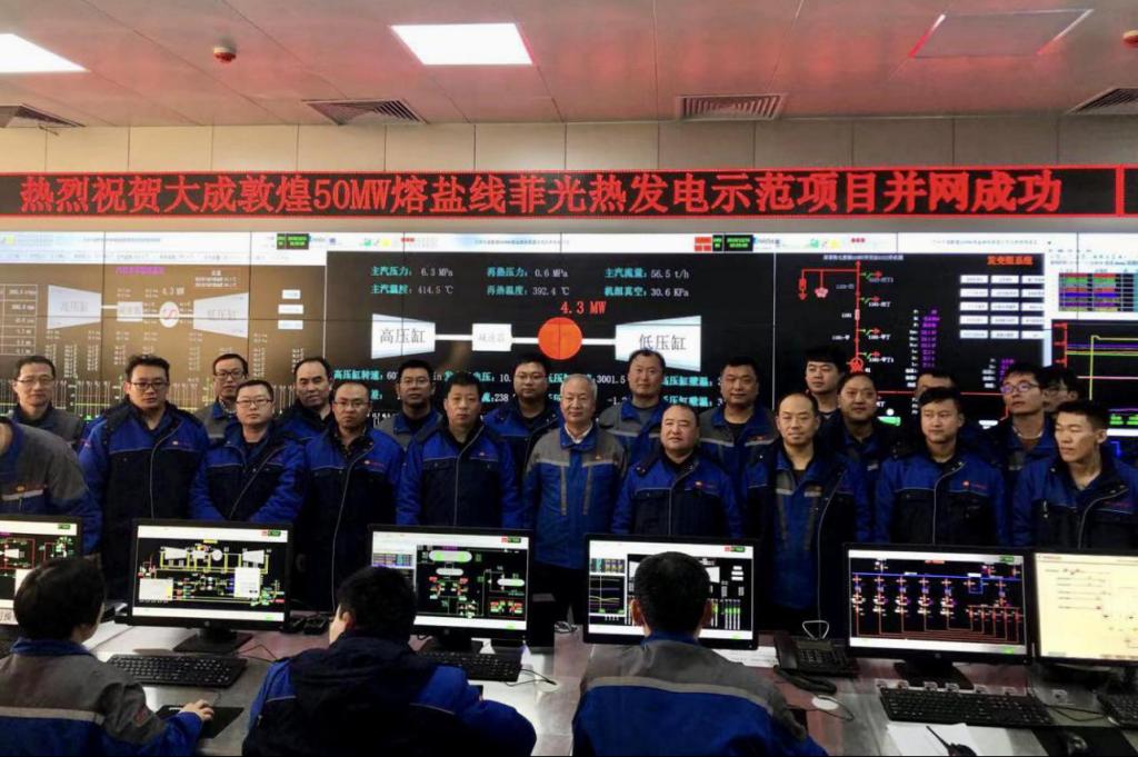 项目于2019年12月31日17时50分首次并网发电成功,目前机组各系统运行状态良好、参数平稳。电站主要参建单位有五家:兰州大成科技股份有限公司,中国电建集团山东电力建设第一工程有限公司、兰州大成聚光能源科技有限公司、兰州交通大学、上海蓝滨石化设备有限公司。项目EPC总包方为中国电建集团中南勘测设计研究院有限公司,项目融资方为中国电建集团租赁有限公司、中国农业发展银行敦煌市支行及甘肃省金融控股集团。