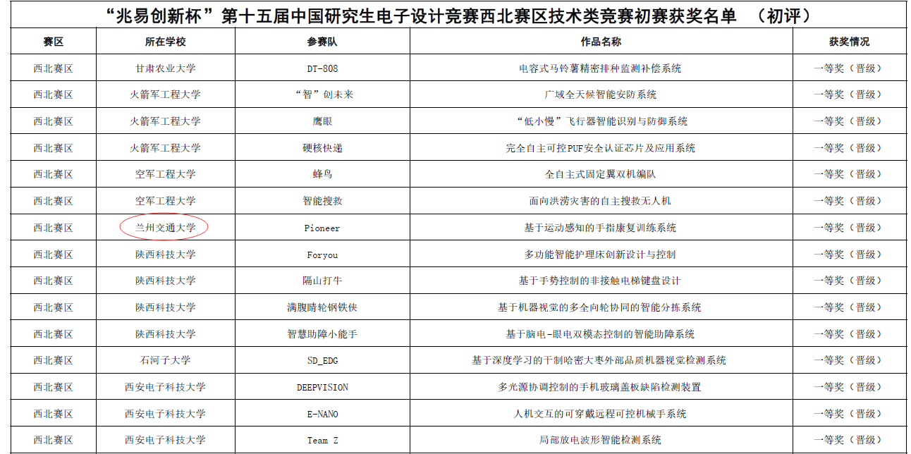 近日,第十五届中国研究生电子设计竞赛西北赛区选拔赛在西北大学太白校区落下帷幕,由我校选派的作品“基于运动感知的手指康复训练系统”喜获一等奖,并成功晋级全国总决赛,指导教师王耀琦老师荣获“优秀指导教师”。同时,我校另外两件作品“基于DE10-Nano的手语翻译系统”和“智能化安全巡检系统”分别荣获二、三等奖。