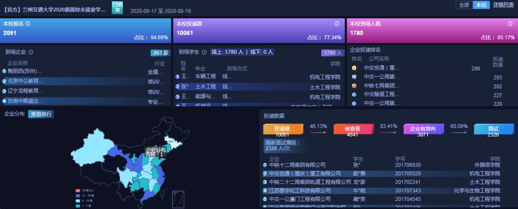 本次双选会共吸引280家用人单位报名参加,到场单位263家,涉及交通运输、通信、建筑、互联网等众多行业。其中国企、上市公司和股份制企业共158家,占比达56%。会上提供招聘职位1165个,岗位需求人数达24127人。据统计,此次双选会共吸引毕业生2469名,其中本校学生2091人,占比84.69%。参会企业共收到学生简历13007份。截止8月18日18时,企业累计向3516人/次发起邀约面试,初步达成就业意向1357人,其中本校学生1017人。双选会结束后,企业将对通过简历筛选但未参与面试的毕业生继续发起面试邀约,尽早完成线上面试、签约等后续工作。此次空中双选会在聚焦2020届未就业毕业生的基础上,也为2021届毕业生提供了良好的就业机会,得到了我校学生的广泛关注与参与。