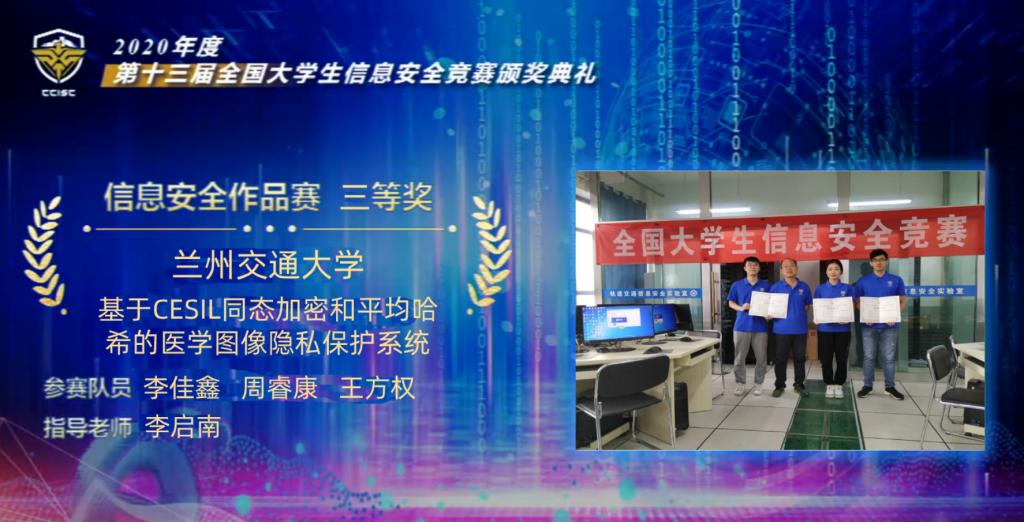 8月18日,第十三届全国大学生信息安全竞赛在北京航空航天大学落下帷幕。我校参赛作品“基于CESIL同态加密和平均哈希的医学图像隐私保护系统”获得全国三等奖,也是甘肃省唯一获奖项目。