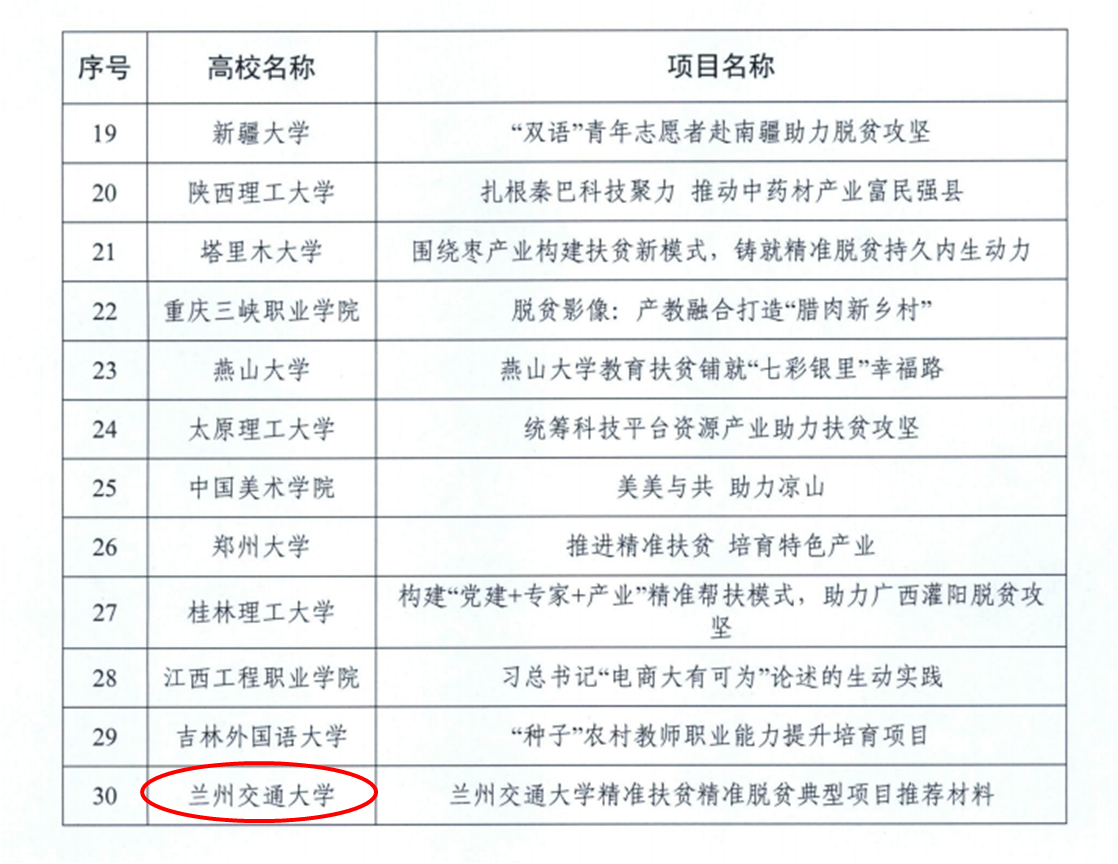 近日,教育部公布“第三届全国省属高校精准扶贫精准脱贫典型项目”评选结果,兰州交通大学申报的“凝心聚力精准帮扶、真抓实干推动发展”项目成功入选,是本届评选中甘肃省唯一入选高校。
