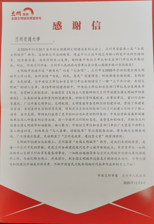 日前,学校收到兰州市委市政府发来的《感谢信》,对兰州交通大学长期以来给予创建全国文明城市工作的大力支持表示衷心的感谢!向以实际行动关心、支持、奉献创建工作的全体交大师生致以崇高的敬意!