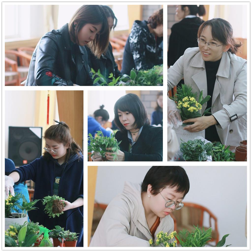 本次培训活动的主题是“用绿色点缀春天--植物组合盆栽”。在培训老师的悉心指导下,平日忙于教学和工作的女教职工兴致勃勃,边学、边做、边交流,充分发挥创造力和想象力,妙手扦插,把白肋万年青、长寿花、袖珍椰子、矾根、皱叶冷水花、网纹草、轮叶豆瓣绿、钻石翡翠等素材变成了一盆盆赏心悦目的艺术品。