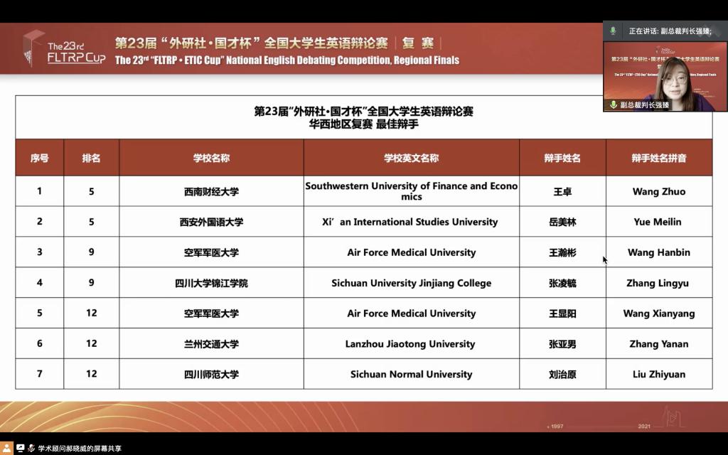 4月17至18日,第23届“外研社·国才杯”全国大学生英语辩论赛华西地区总决赛在互联网云端落下帷幕。由我校张亚锋老师带队、外国语学院2019级英语口译专业瞿丽娟和张亚男同学组成的代表队获得华西区总决赛一等奖,以总分排名第六的优异成绩成功晋级全国总决赛。张亚男同学获得本次大赛的最佳辩手奖,强臻老师被聘为全国赛评委及地区赛副总裁判长。