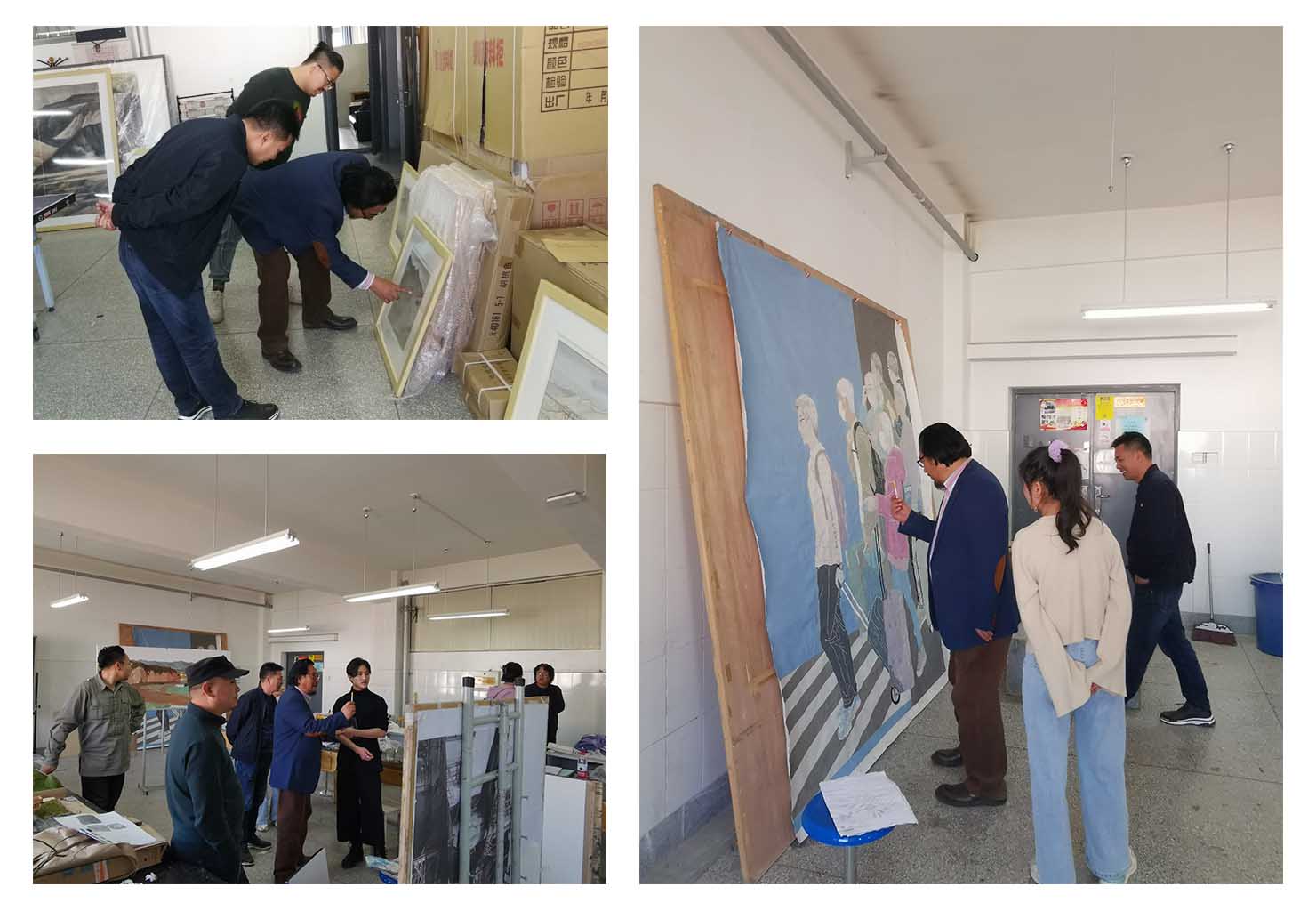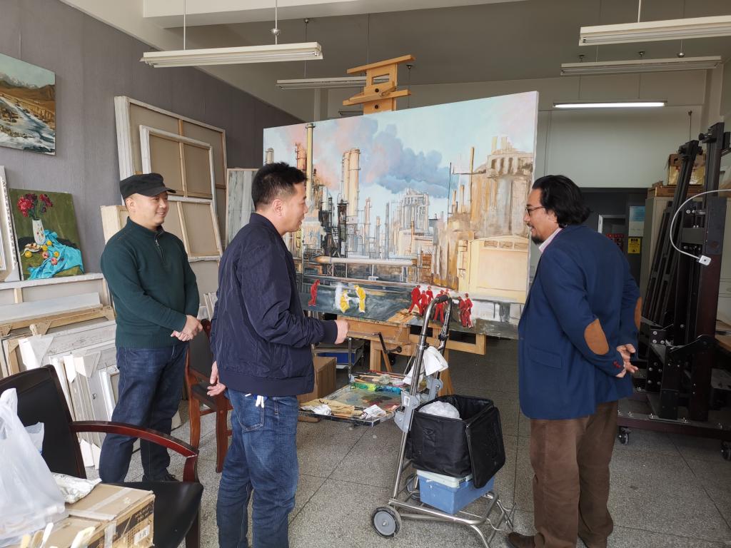 艺术设计学院院长郭殿声及相关教师陪同参观了我校教师正在创作的“献礼建党100周年讲好陇原英模故事”主题创作,并围绕本次创作题材选择、构图布局、中西方绘画技法的关系以及中西绘画相互借鉴、学习等问题进行了指导和深入交流。