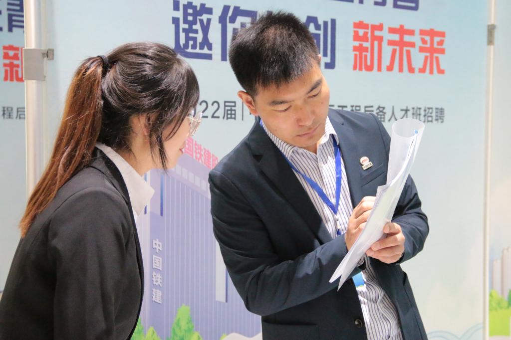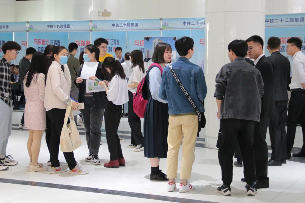 5月9日,中国铁建旗下21家子公司在大学生活动中心举行中国铁建股份有限公司国际工程后备人才班专场招聘会。招聘范围涵盖土木工程类、建筑类、材料类、管理学类、经济学类、文学类等多个专业。我校2022届毕业生参与了招聘会,现场气氛十分热烈。