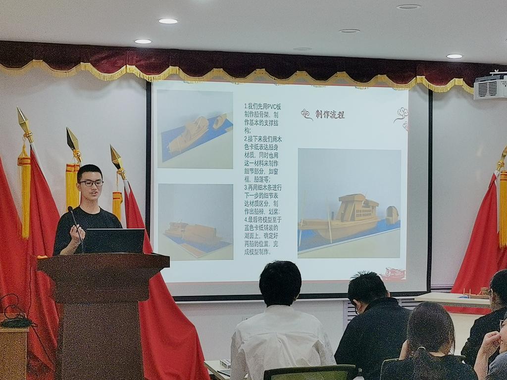 在比赛中进入决赛的八名同学,通过PPT展示了中国共产党的光辉历史,充分发挥个人的专业优势,介绍了红色建筑模型的历史背景、制作过程、方法以及理念。作品《红船》做工精细,采用实与虚的立体空间表达方式逼真还原了“一大”纪念船——“南湖红船”;作品《中共一大会址》以精美的雕刻、整体的协调引人注目;作品《中共四大会址》以KT板为材料,对四大原址进行复原和马克笔的填充;作品《中央红军长征出发纪念碑》以PVC板为主要材料,按照一定的比例尺寸来设计,给人一种雄伟、雄壮之感。