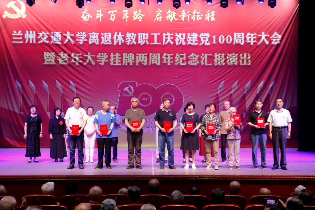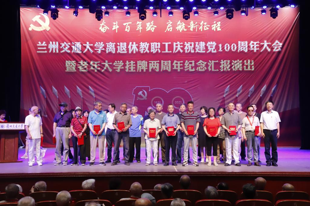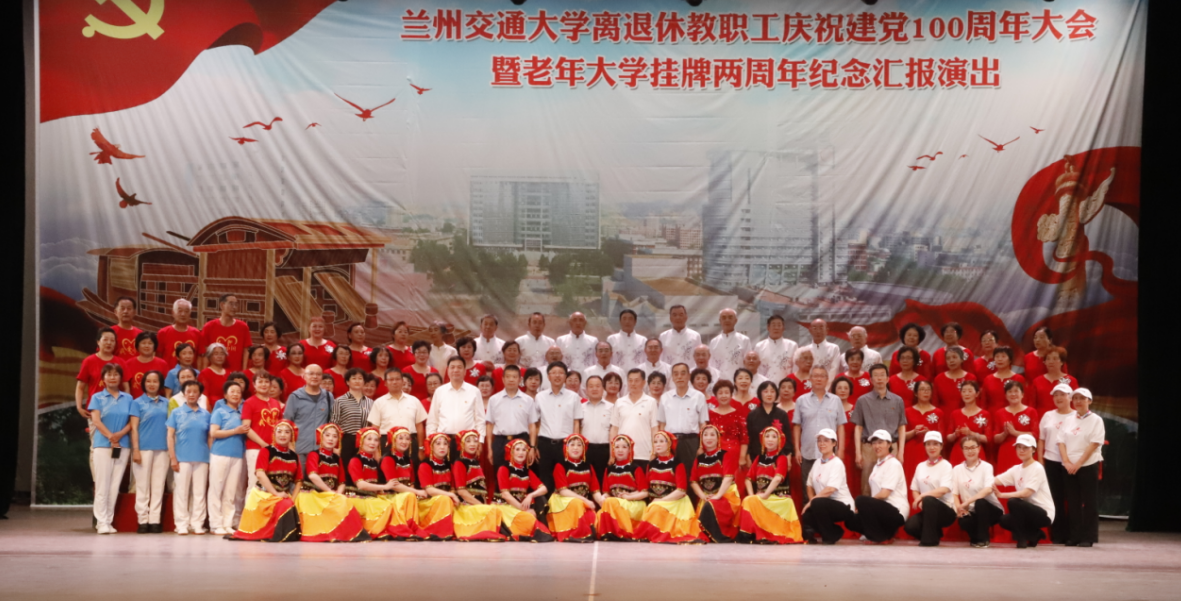 6月10日下午,由兰州交通大学离退休教职工党委、离退休教职工服务中心和老年大学共同举办的离退休教职工庆祝建党一百周年大会暨老年大学挂牌两周年纪念汇报演出在学校大礼堂举行。校党委书记杨子江、副书记买寿清、副校长朱廷珺出席大会。省委老干部局一级调研员侯耀升,教育厅老干部处处长王筱亭,以及来自省内兄弟院校的老干部工作负责人到场祝贺。学校相关部门负责人,500余名离退休教职工参加庆祝活动。