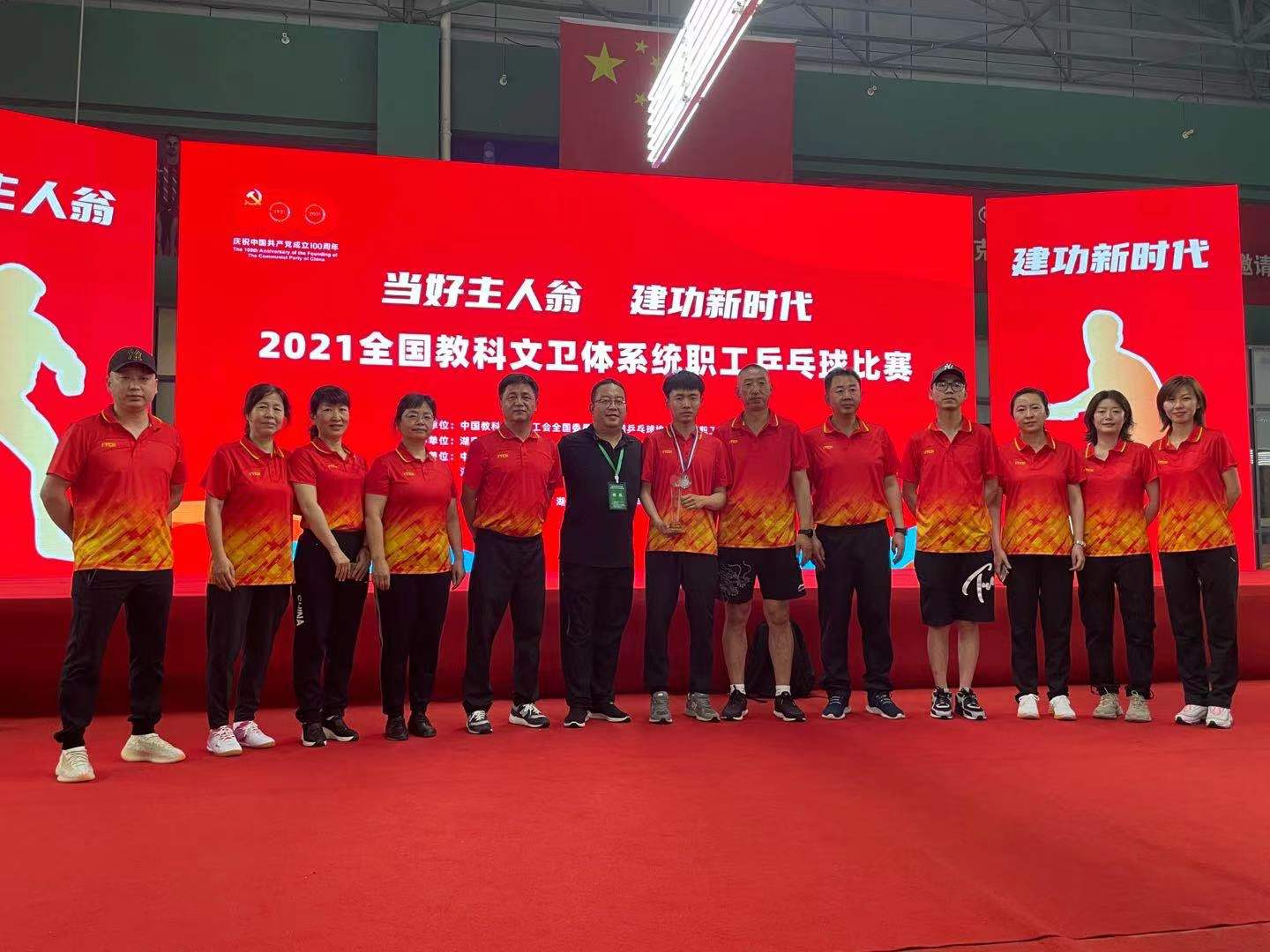 近日,由中国教科文卫体工会、中国乒乓球协会、中国职工发展基金会等单位联合主办,湖南省教育工会承办的“当好主人翁、建功新时代”2021全国教科文卫体系统职工乒乓球赛在长沙结束。本次比赛全国教科文卫体系统选派了35个队伍,甘肃省教科文卫选派12名职工参加了此次比赛,其中我校王立民、黄春红、李金、胡京汉、李鑫、康楠6名老师为本次比赛的主力参加了比赛。