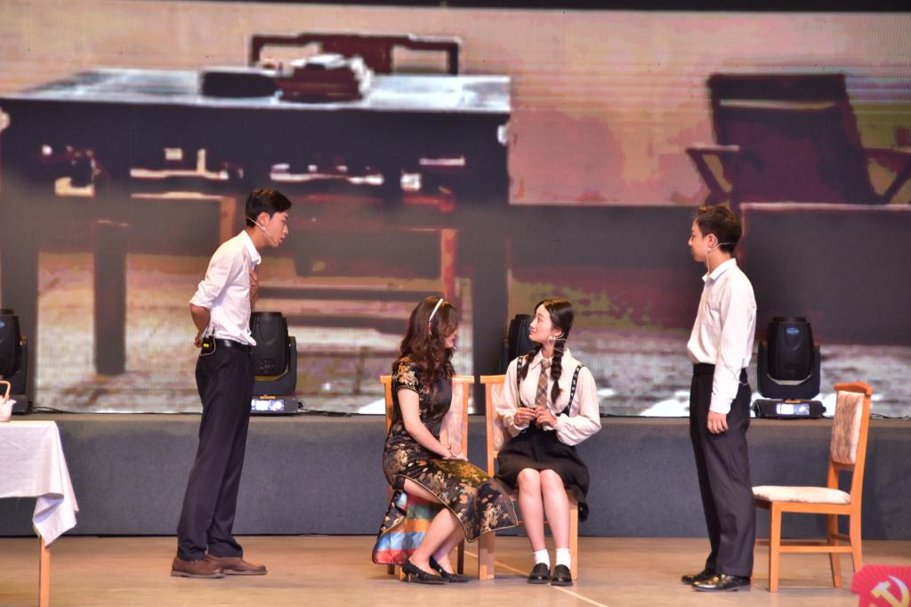 此次演出的话剧是由我校2020级汉语国际教育专业研究生张恩榕编导的原创话剧《共产党宣言之黎明前夜》。该故事的背景是发生在中国革命风起云涌的上世纪30年代。彼时,中国共产党与国民党反动派进行着生死较量,这是对共产党人的一次严峻考验。这一时期,风云变幻,每个人都面临着理想与信念的选择。该剧充分发挥话剧艺术的优势,着力塑造了一批在《共产党宣言》的精神引导下,为追求理想、救国救民的有志青年走上革命道路的一段历程,他们在生与死、荣与耻、名与利的考验中,用无私无畏的献身精神与英雄气概,诠释了一部“现实版”的《共产党宣言》。在整个演出过程中,观众一次又一次被剧情感动,现场掌声如雷。