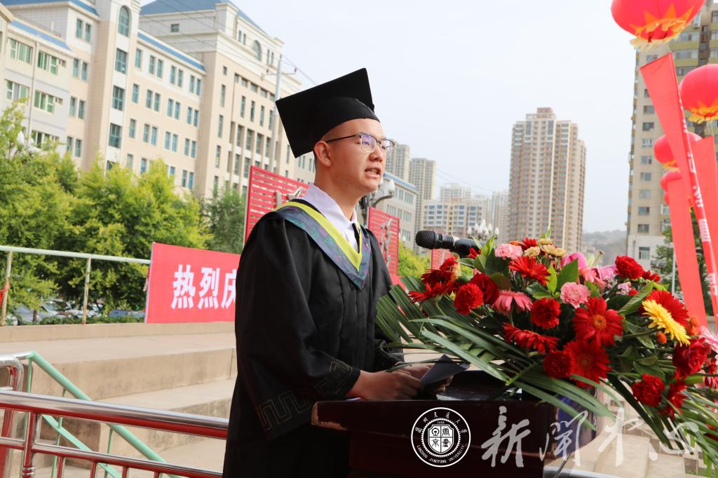 上午8时,典礼在庄严的国歌声中拉开了序幕。电子与信息工程学院本科生张雪剑、测绘与地理信息学院硕士生张鑫港分别代表毕业生向母校和各位老师及同学朋友致以最崇高的敬意和最诚挚的感谢。他们回顾了自己在交大的求学生活,并有幸欢庆了母校的甲子华诞、见证了母校“十三五”期间的蓬勃发展、经历了与全校师生一起打赢抗击新冠疫情的战斗等重要时刻,深切地感受到兰交大人的团结力量和使命担当。他们号召全体毕业生在毕业之后继续秉承“奋发向上、艰苦朴素、刻苦钻研、严谨治学”的校风和“尚德、励志、博学、笃行”的校训,在对祖国和社会的积极回馈中展现交大学子应有的风采和担当。