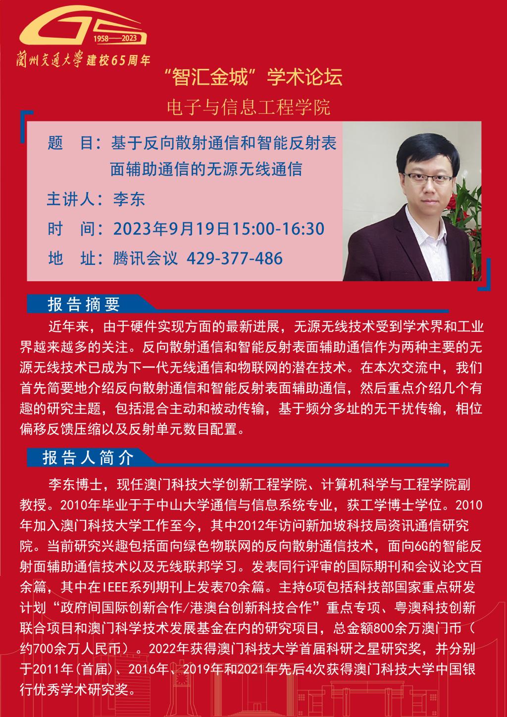 兰州交通大学“智汇金城”学术论坛预告——基于反向散射通信和智能反射表面辅助通信的无源无线通信