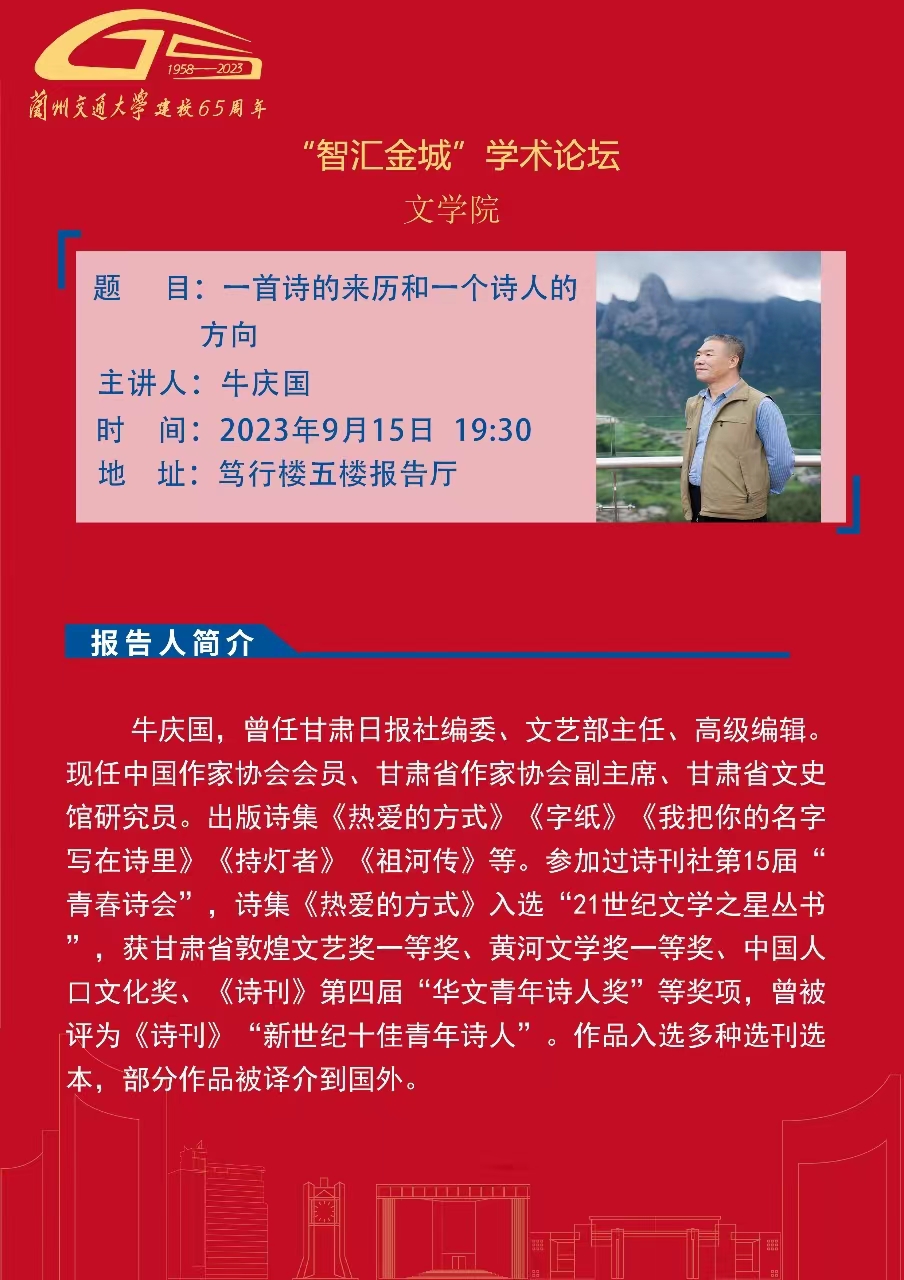 应文学院邀请,原甘肃日报社编委、文艺部主任、高级编辑,现中国作家协会会员、甘肃省作家协会副主席、甘肃省文史馆研究员牛庆国将为全校师生作题为“一首诗的来历和一个诗人的方向”的专题报告,详情见海报。欢迎全校师生参加。