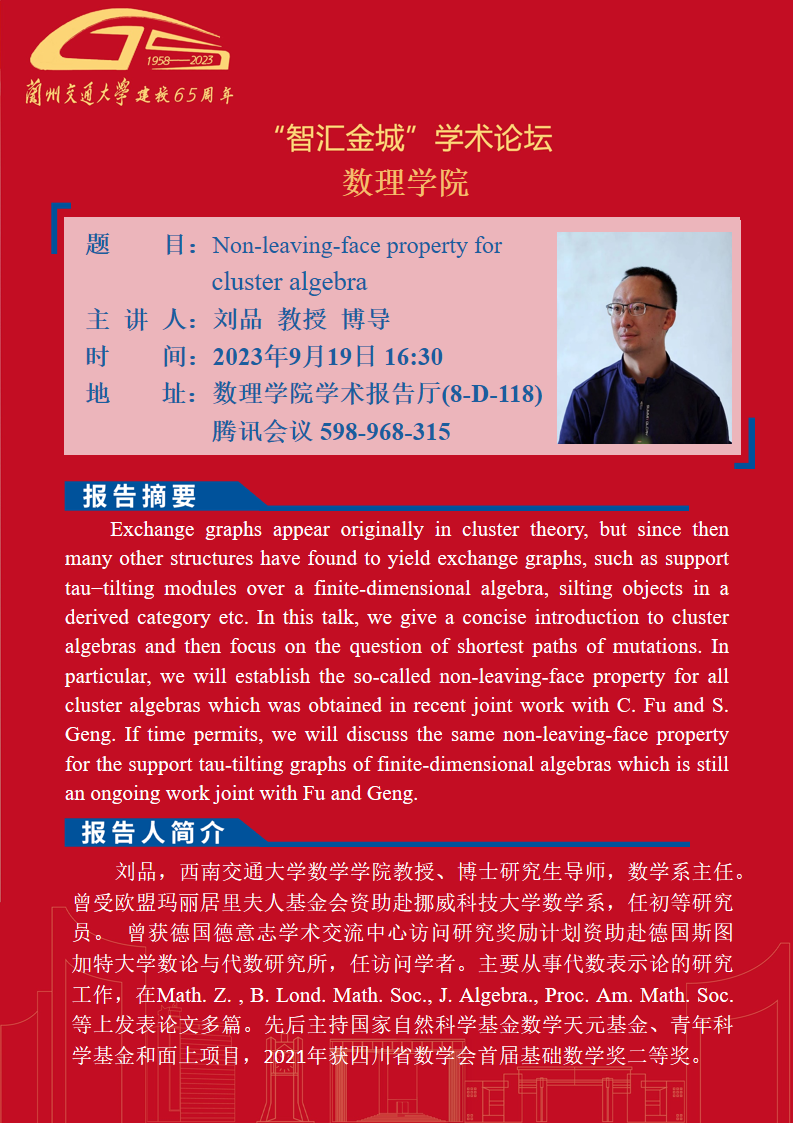 应数理学院邀请,西南交通大学数学系系主任刘品教授将为全校师生作“Non-leaving-face property for cluster algebra”的专题报告,具体内容详见海报。欢迎全校师生参加。