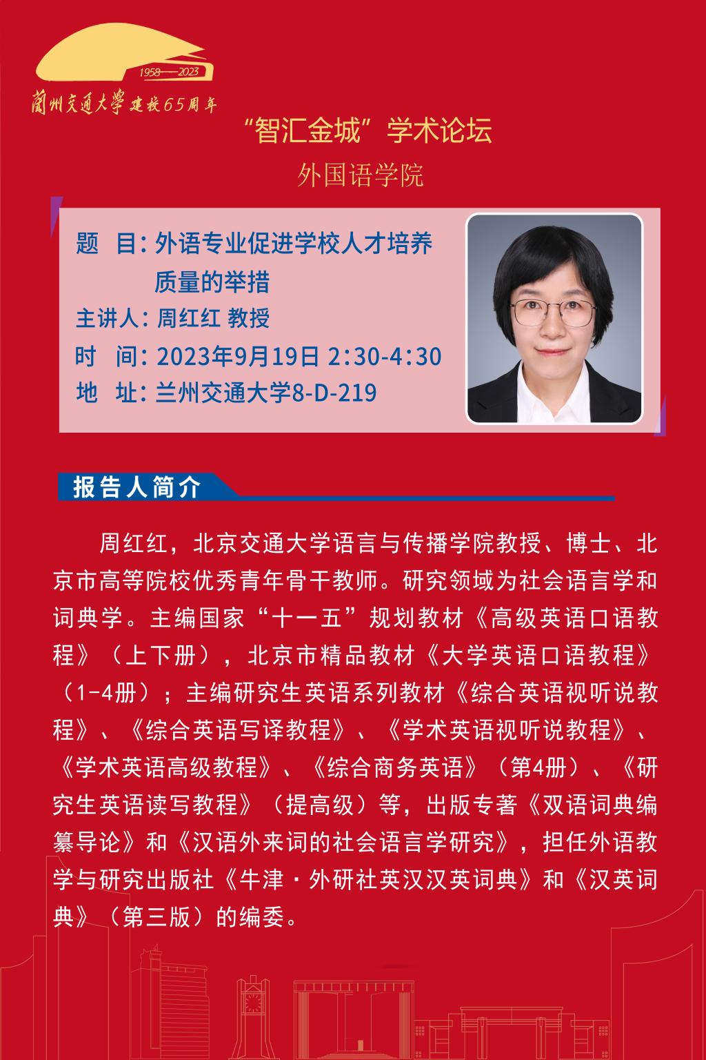 应外国语学院邀请,北京交通大学语言与传播学院教授周红红将为全校师生作学术报告,报告内容详情见海报。欢迎全校师生参加。