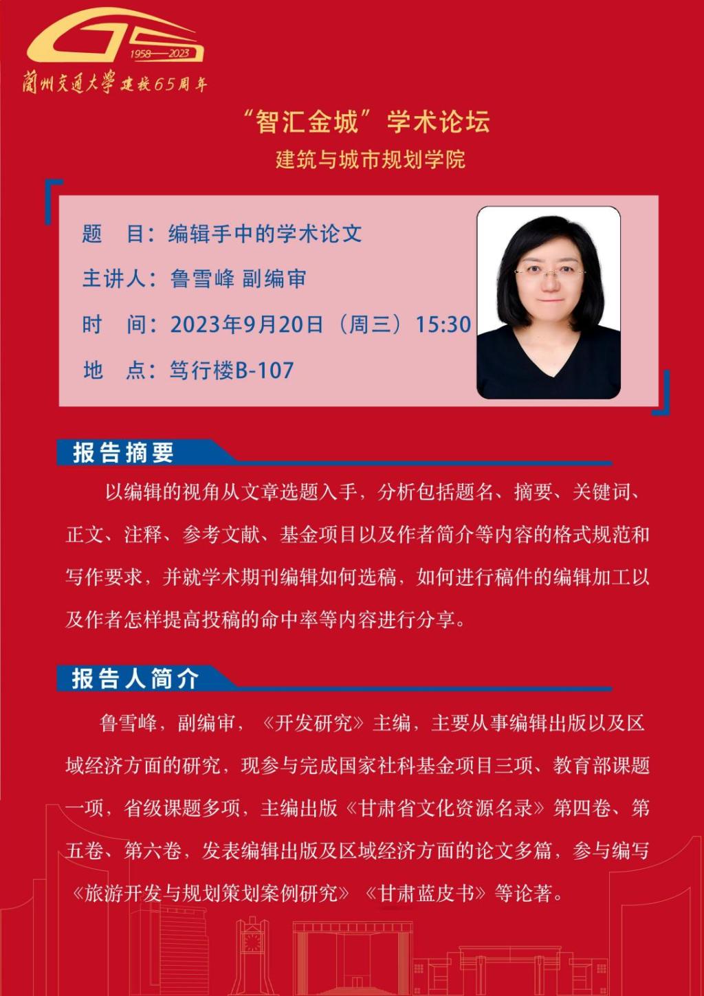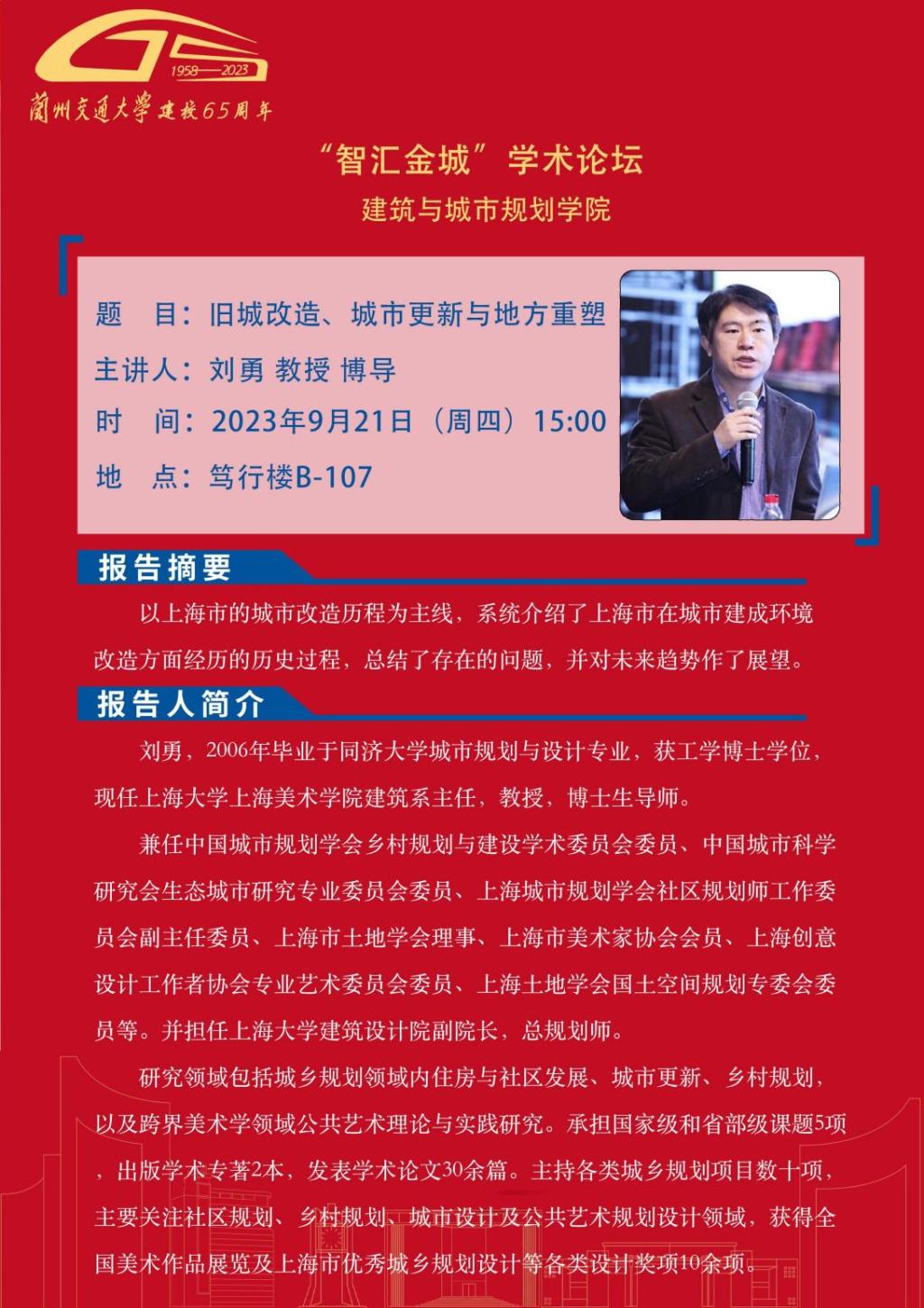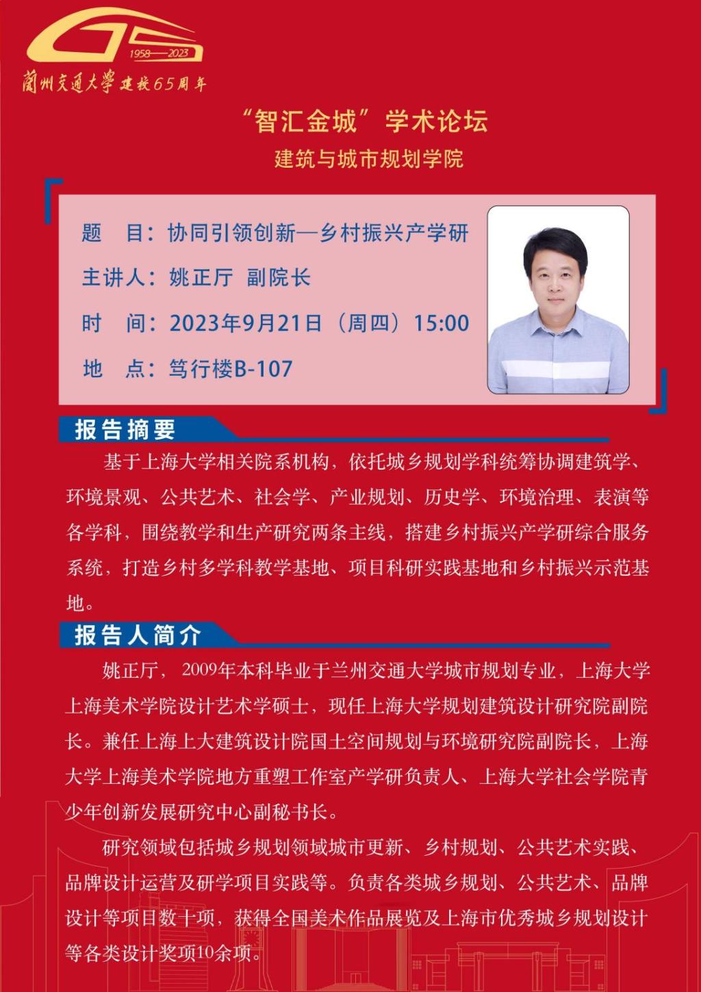 应建筑与城市规划学院邀请,甘肃省社会科学院鲁雪峰副编审、上海大学上海美术学院教授刘勇、上海大学规划建筑设计研究院副院长姚正厅将为全校师生作学术报告,报告内容详情见海报。欢迎全校师生参加。