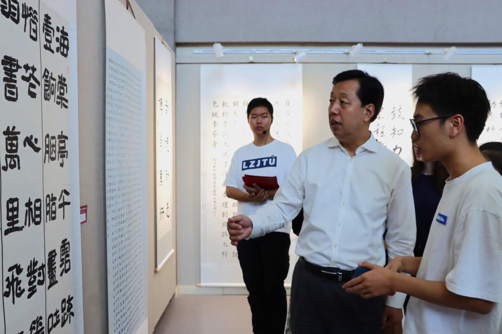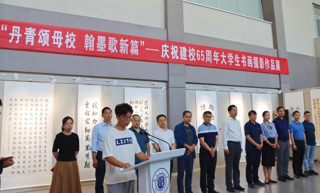9月15日中午,由校团委主办,电信学院团委、环境学院团委、建筑学院团委、艺术学院团委承办的兰州交通大学“丹青颂母校翰墨歌新篇”庆祝建校65周年大学生书画摄影作品展在天佑美术馆开幕。校党委常委、副校长马军党出席开幕仪式。党委(校长)办公室、党委宣传部、校工会、学生工作(部)处、校友会、校史馆、天佑美术馆、校团委、电信学院、环境学院、建筑学院、艺术学院等单位主要负责同志、各学院团委书记及学生代表共计200余人参加了仪式。