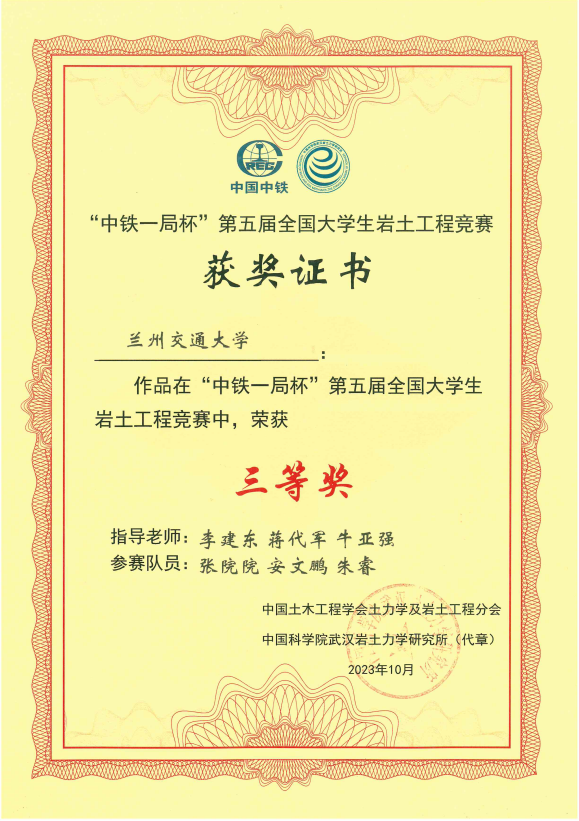 全国大学生岩土工程竞赛自2015年发起举办以来,每两年一届。截至目前,兰州交通大学参加了其中四届比赛决赛,获得全国二等奖1次、三等奖3次。竞赛为学生提供了一个顶级的岩土竞技平台,激发了青年学生的创新意识,提高了大家对岩土工程及相关学科的学习兴趣,锻炼了学生的动手实践能力和协作精神。