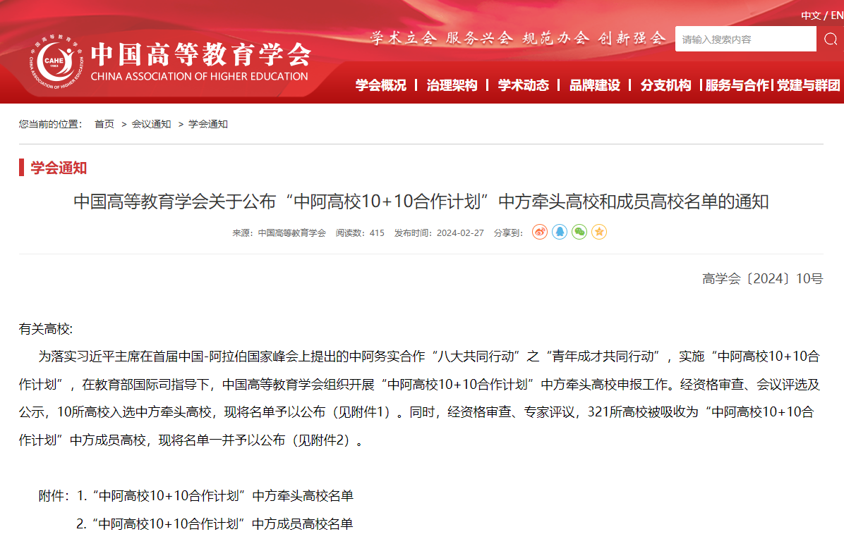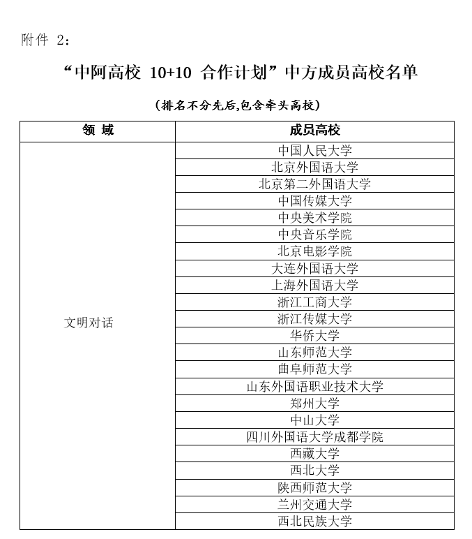 近日,中国高等教育学会公布了“中阿高校10+10合作计划”高校名单,我校入选成为该合作计划文明对话领域成员高校。该领域共有中国人民大学、北京外国语大学、中国传媒大学、上海外国语大学、中山大学及郑州大学等61所高校入选。