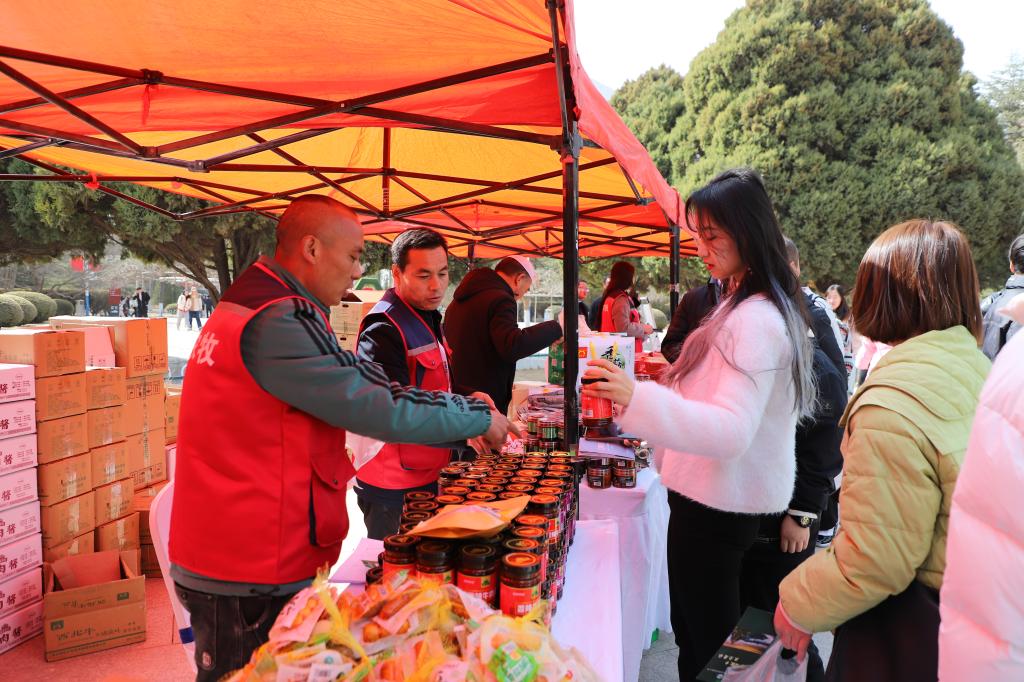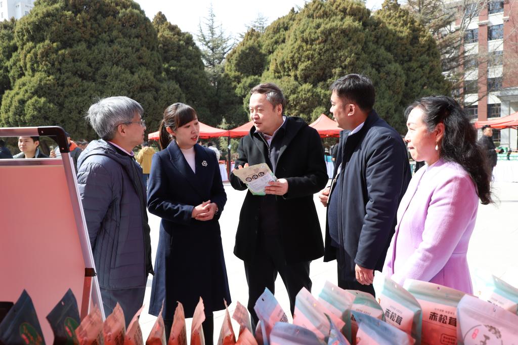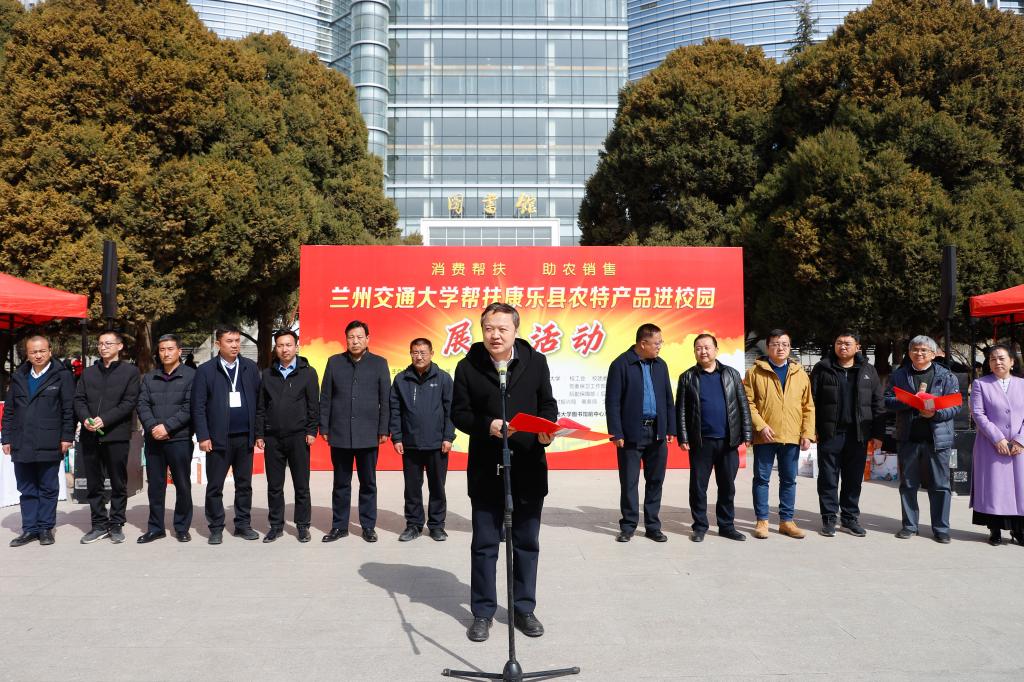 为进一步发挥兰州交通大学帮扶力量,巩固拓展脱贫攻坚成果,激发脱贫群众内生动力,拓宽农特产品销售渠道,支持康乐县特色产业发展,3月8日至9日学校组织举办康乐县农特产品进校园展销活动。8日上午,学校在图书馆前举行了展销活动开幕式,兰州交通大学副校长霍海峰出席,校工会、校团委、保卫工作部、后勤保障部、社会服务与成果转化中心负责人,康乐县委副书记袁洁,县乡村振兴局、文旅局、美食产业与电商发展中心、鸣鹿乡、八丹乡负责人,康乐县富康循环农牧产业发展投资有限责任公司、西北牛香菇发展食品有限公司负责人等一同参加了开幕式。