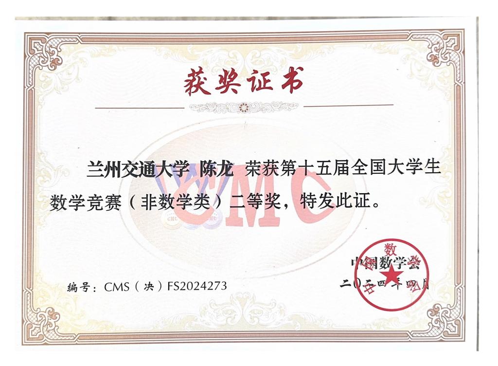 4月19至21日,由山东大学、山东数学会承办的第十五届全国大学生数学竞赛全国决赛在山东大学举行。我校3名学生进入非数学专业组A类全国决赛并斩获佳绩,其中陈龙(交通运输学院)同学获国家二等奖、罗桂乾(交通运输学院)和任小乐(机电工程学院)同学荣获国家三等奖。