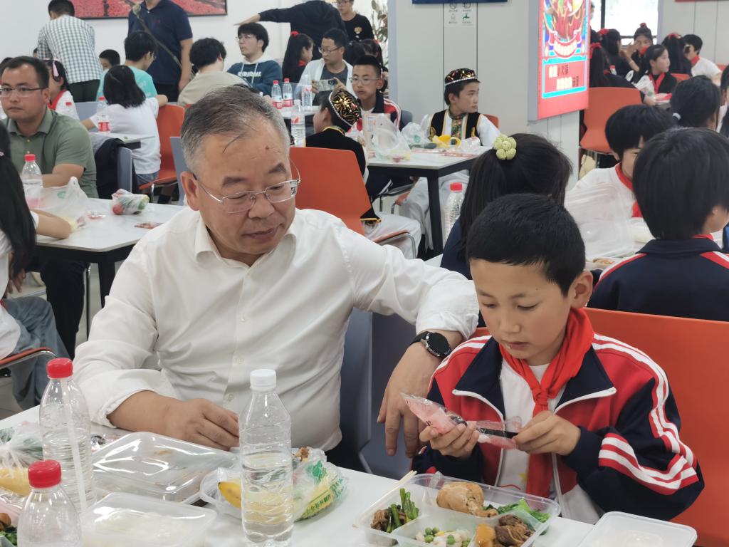 活动以科普教育,互动交流、推普宣传、经典诵读、励志教育、关心关爱活动为主旨,开展了一系列丰富多彩的交流、交融、互动活动。校党委副书记王爱平出席活动,与孩子们在食堂一起用餐,共庆“六一”,并与学区负责人和师生亲切交流,了解了村小学教育教学情况,关切的询问了孩子们的学习和日常生活情况。
