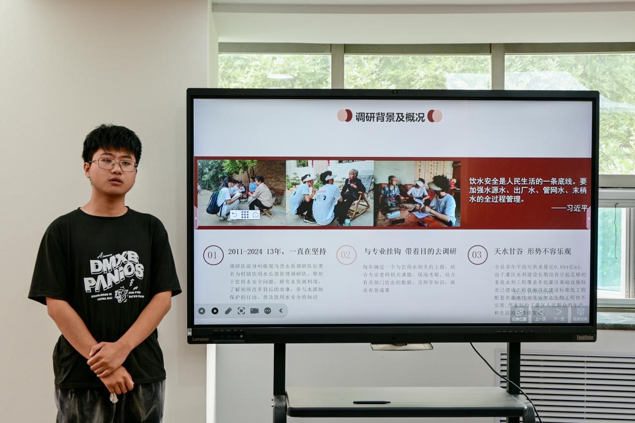在结项答辩中,各团队根据抽签顺序进行成果展示以及现场答辩。答辩人通过红色足迹寻访、中华文化传承、环保科普教育、助力乡村振兴、校企合作的内容,重点对宣传报道、视频展示、调研报告等方面,对实践成果进行总结汇报。各位答辩人图文并茂地展示学院实践活动的整体精神风貌,内容丰富、特色鲜明、精彩纷呈。