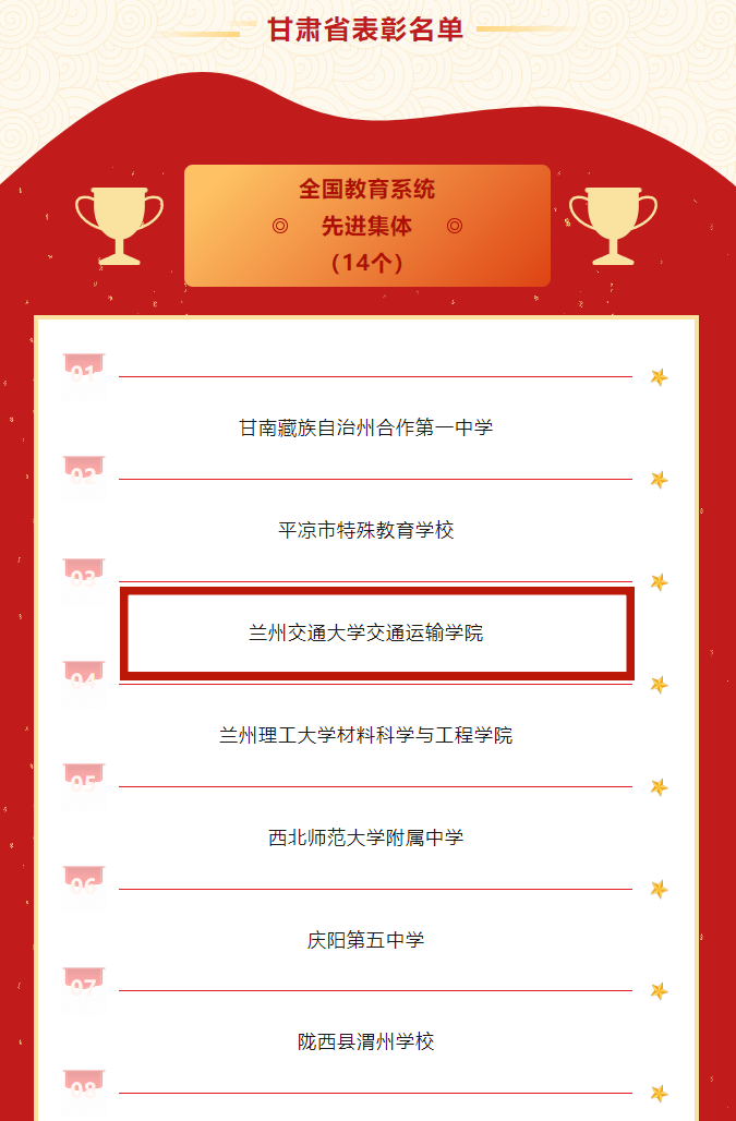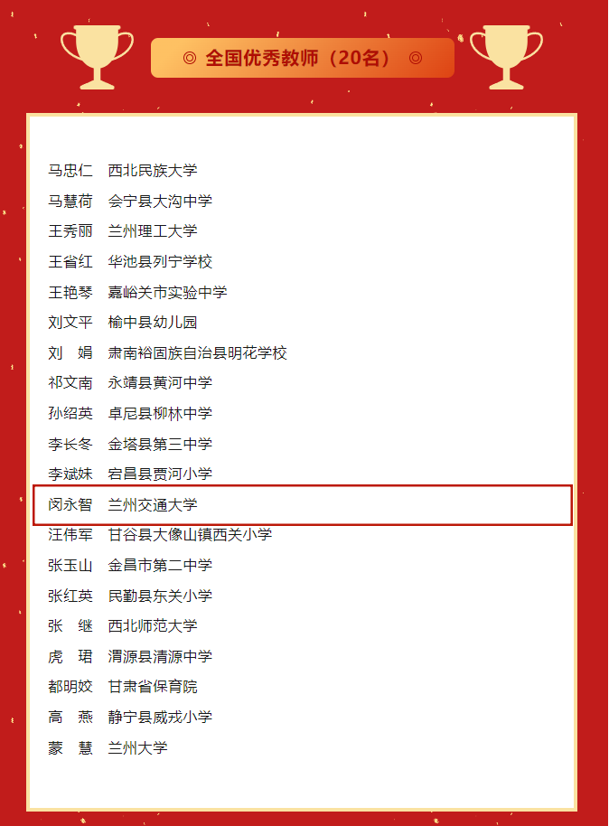 近日,人力资源和社会保障部、教育部授予585个单位“全国教育系统先进集体”称号,716名同志“全国模范教师”称号,895名同志“全国优秀教师”称号,80名同志“全国教育系统先进工作者”称号,99名同志“全国优秀教育工作者”称号。我省14个集体41名教师荣获表彰。其中,兰州交通大学交通运输学院获评“全国教育系统先进集体”,自动化与电气工程学院闵永智教授获评“全国优秀教师”。