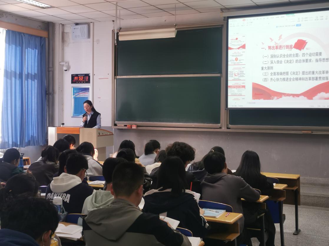 王珺在课前给同学们发放了《中共中央关于进一步全面深化改革推进中国式现代化的决定》(以下简称《决定》)单行本。在授课过程中,以《改革的实践续篇现代化的实践新篇》为题,结合《决定》的内容,深入分析了从“全面深化改革”到“进一步全面深化改革”所蕴含的理论逻辑、历史逻辑和现实逻辑,让同学们深入了解进一步全面深化改革为何改、为谁改、怎样改,强调进一步全面深化改革是推进中国式现代化不断发展的内在要求和时代使命。