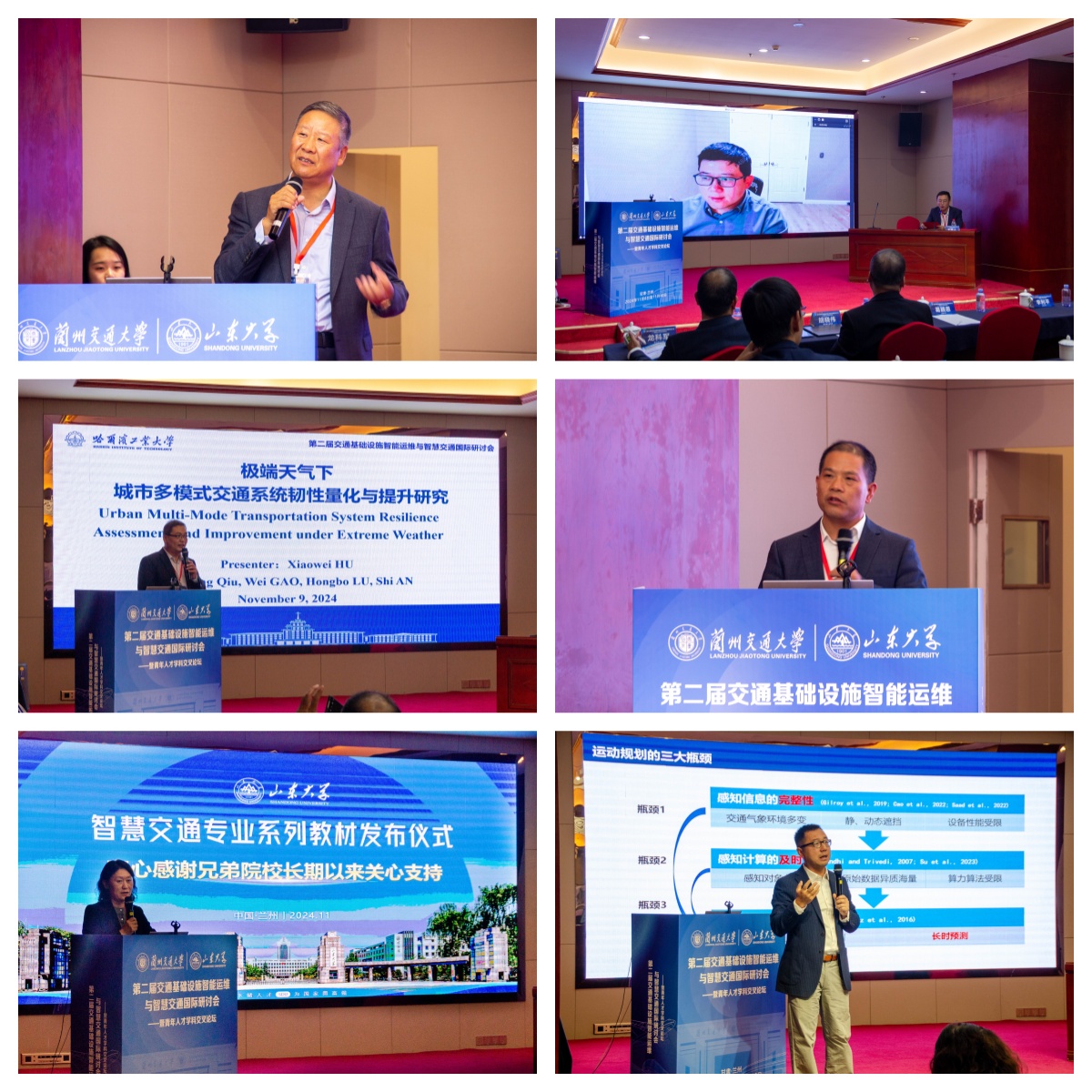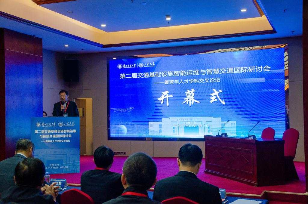 11月8日至10日,由兰州交通大学和山东大学主办的第二届交通基础设施智能运维与智慧交通国际研讨会暨青年人才学科交叉论坛在兰州举行。来自美国内华达大学、山东大学、北京交通大学、长安大学、北京工业大学、哈尔滨工业大学、西南交通大学、长沙理工大学、中国民航大学、甘肃新视能科技有限公司、中国西北市政工程设计研究院有限公司、北京千乘科技有限公司等单位的百余位领导和专家学者集聚一堂分享成果、交流理念、共话前景。中国智能交通协会副理事长关积珍、中国岩石力学工程学会常务副理事长李利平、兰州交通大学副校长苏程、兰州交通大学校长助理黄仕平等领导出席论坛开幕式,开幕式由交通运输学院院长钱勇生主持。
