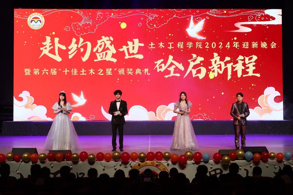晚会现场还进行了土木工程学院第六届“十佳土木之星”颁奖典礼。学院在“博学、科研、励志、进步、双创、实践、志愿、文艺、体育、宣传”十个方面表现优异的学生依次登台展示,现场播送学院授予每位同学的颁奖词。朱廷珺为获奖同学颁奖,激励着在场的全体2024级学生从身边的榜样中汲取力量,明确个人志向,树立崇高目标,不断提升自身的专业素养与综合能力,努力成长为有理想、有本领、有担当的新时代青年。