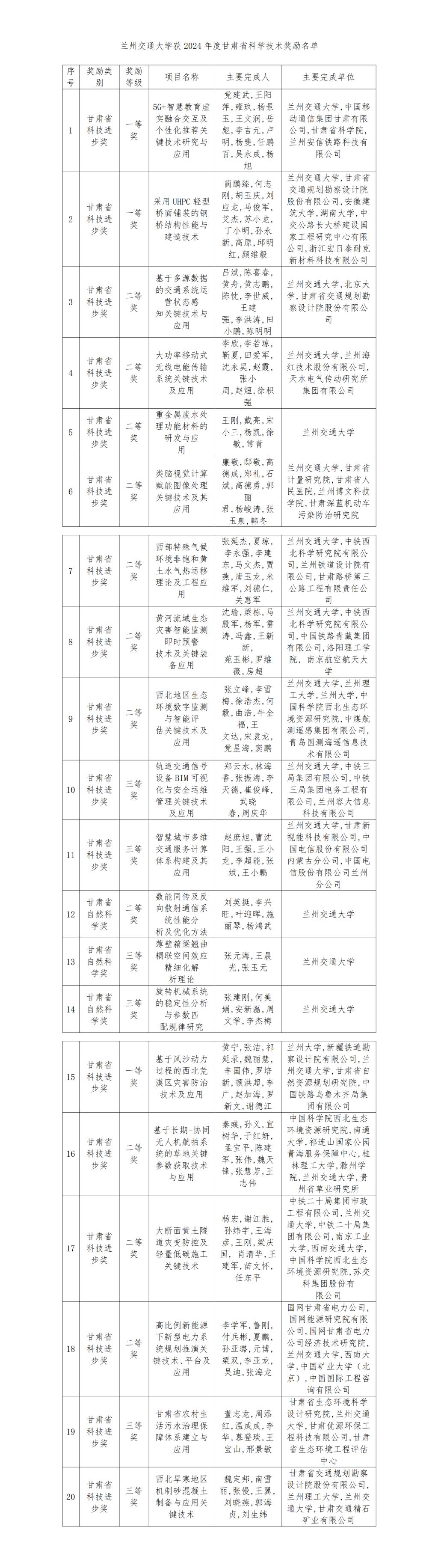 近日,甘肃省人民政府发布《甘肃省人民政府关于2024年度甘肃省科学技术奖励的决定》(甘政发〔2025〕29号)。我校共获甘肃省科学技术奖励20项。作为第一完成单位荣获甘肃省科技进步奖11项(其中一等奖2项、二等奖7项、三等奖2项),甘肃省自然科学奖3项(其中二等奖1项、三等奖2项);作为参与单位荣获甘肃省科技进步奖6项(其中一等奖1项、二等奖3项、三等奖2项)。