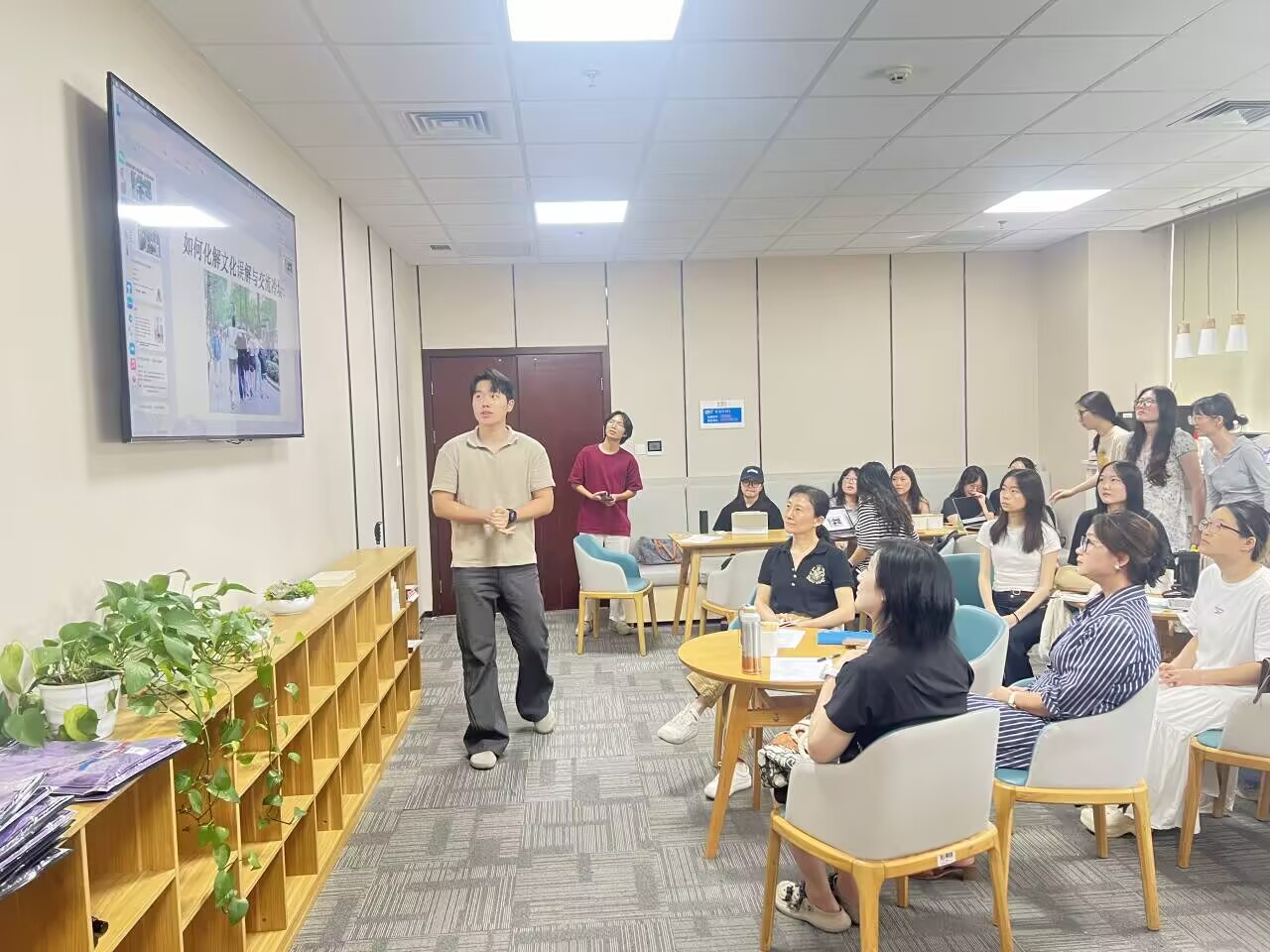 7月1日下午,外国语学院俞森林院长主持召开了交流座谈会。他重点介绍了汉语国际教育专业建设历程和实践创新特色,尤其是学院服务高铁“走出去”战略强化中外文化交流的办学特色与发展优势。国际汉语系主任王海玲分享了“中文+轨道交通”国际化人才培养模式,介绍了为“一带一路”沿线国家留学生量身定制的专业课程模块、行业导师制度、特色海外实践基地建设,并解读了“理论+研培+实践+反思”的特色教学模式。两校深入探讨了“研究生联合培养”“海外实习基地建设”等合作可能,并初步探讨了共建“轨道交通汉语教学资源库”的设想。调研组还就本科专业建设、研究生学术能力培养机制、国家社科基金项目培育以及研究生学术论坛品牌化运作等具体问题进行了咨询。俞森林院长强调:“对口支援进一步筑牢了两校院际交流的根基,我们要共同努力构建高质量发展的友谊桥梁。”会后,我们实地考察了外国语学院特色办公环境,观摩了学生暑期对外文化交流实践项目的筹备工作。