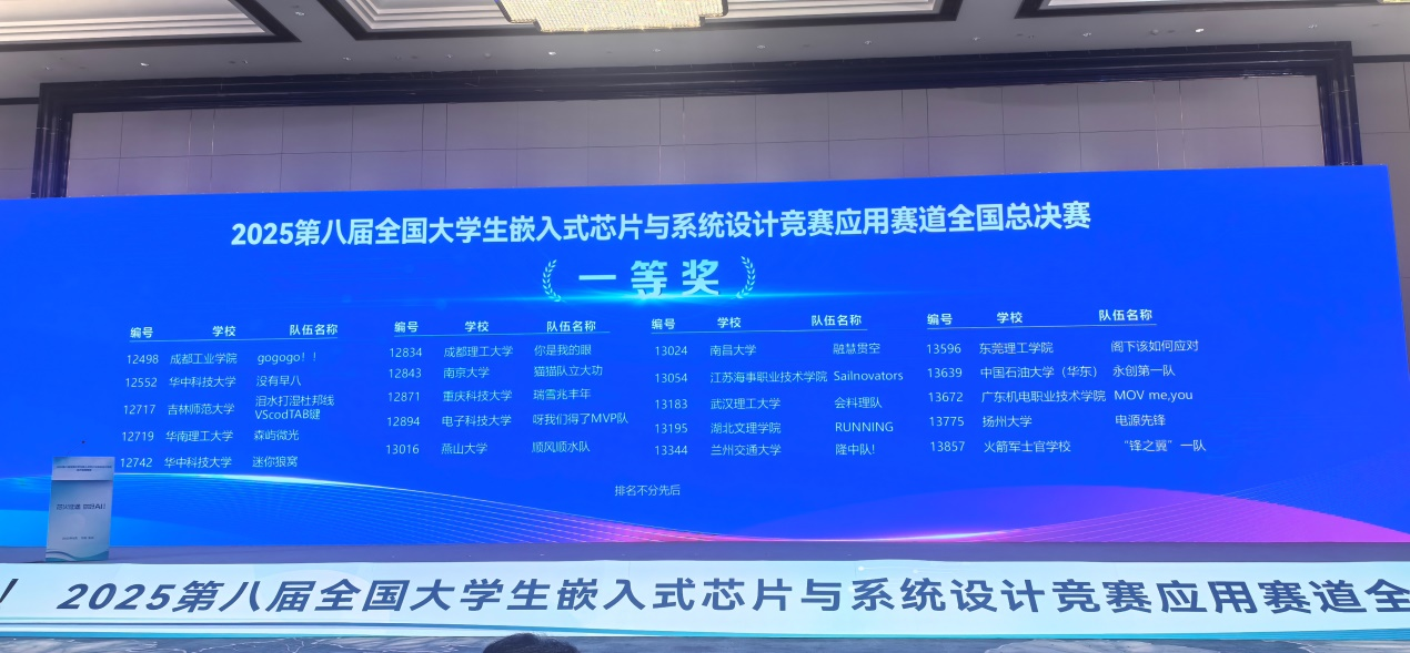 8月13日,由中国电子教育学会主办,东南大学与南京江北新区管理委员会联合承办的第八届全国大学生嵌入式芯片与系统设计竞赛(应用赛道)全国总决赛在南京集成电路产业中心圆满落幕。我校参赛学子凭借卓越的创新能力和扎实的工程实践水平,在全国总决赛中表现突出,共斩获全国一等奖1项、二等奖2项、三等奖2项。同时,我校荣获本届赛事的“优秀组织奖”,充分体现了学校在赛事组织与人才培养方面的综合实力。