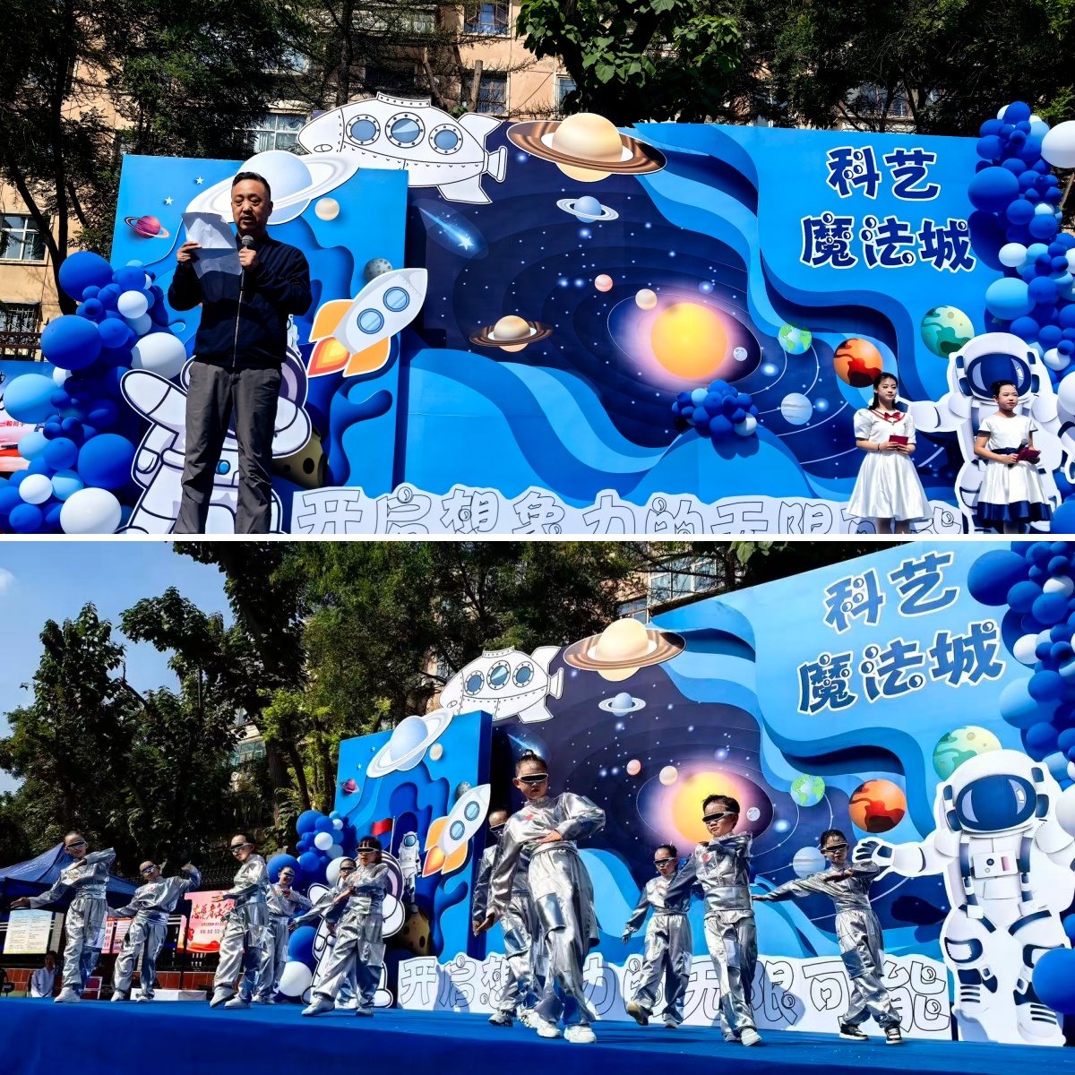 附属小学操场中心舞台区乐声渐起,为全场师生揭开科技节的神秘面纱,校长的精彩致辞更将“智育实践,创新成长”的理念深深植入每个人心中。随即,机械舞表演的金属质感与科学秀剧场的奇幻实验交相辉映——舞者肢体的精准律动恰似编程代码的流畅运行,科学秀里“化学魔术”的色彩迸发宛如未来世界的能量跃迁,瞬间点燃全场热情,宣告这场“科艺魔法城”狂欢正式启幕。