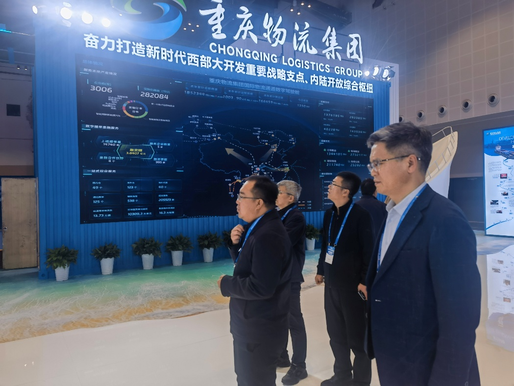 最后,调研组一行参加了由重庆市人民政府口岸和物流办公室、中国国际贸易促进委员会重庆市委员会共同主办的2025陆海新通道国际物流博览会,此次展览展示活动汇聚了物流技术装备、智慧物流与物联网技术应用、物流供应链等多个领域的企业参展。通过参观展览,调研组得以近距离了解陆海新通道在连接“一带一路”合作中的重要桥梁作用,以及科技创新在其中起到的关键驱动作用。