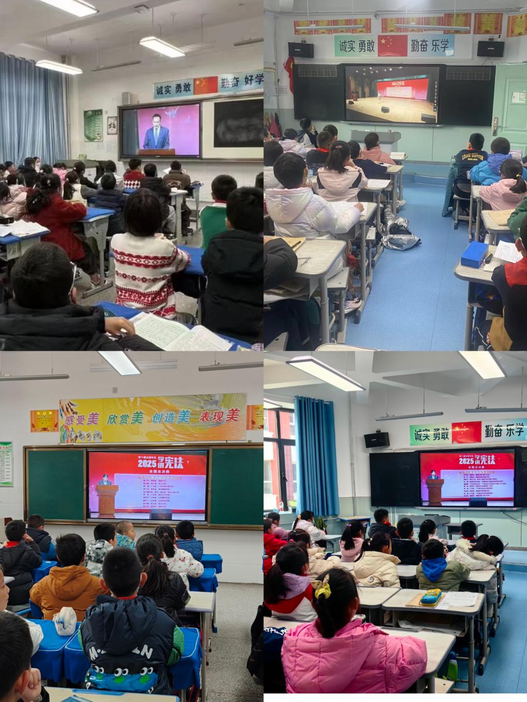 12月4日国家宪法日当天,全校师生同步参与教育部“宪法晨读”活动,在庄严的跟读中感受宪法权威,增强法治敬畏之心;红领巾广播站推送宪法小知识、法治小故事,让法治氛围在校园潜移默化浸润;课堂教学中,教师们将抽象的法律条文与校园生活、社会热点相结合,实现法治教育与思政德育的无缝衔接,引导学生树立“学法、懂法、守法、用法”的自觉意识;各班利用班队会时间,组织开展了形式多样的“宪法宣传周”主题班队会活动,为同学们提供了一个交流和展示的平台,进一步巩固了宪法学习的成果。