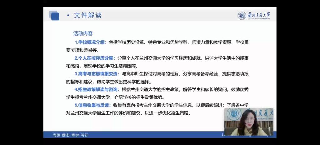 为确保活动高质量推进,招生就业处招生办公室以“线上+线下”相结合的方式,为全体同学开展专题培训。培训会上,相关负责老师立足交通强国战略背景与学校发展定位,系统解读了学校招生政策要点、最新办学成果、学科建设特色及就业发展新态势;围绕宣讲纪律、沟通礼仪、信息传递准确性等核心要求,明确了“精准传递、生动表达、真诚互动”的宣讲准则,强调要精准阐释学校历史沿革、专业设置、奖助体系等关键信息。同时,鼓励同学们立足自身成长经历,用青春话语体系讲好交大的学术故事、人文故事、成长故事,让高中师生全方位、深层次感知交大的学术底蕴与人文温度。
