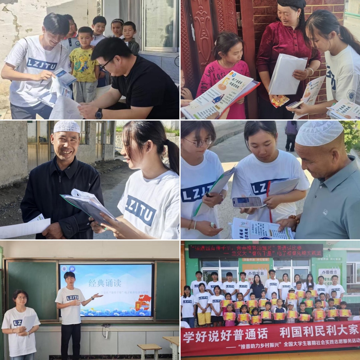 2025年7月,学校各级团组织积极响应国家“推普助力乡村振兴”战略部署,组建多支大学生暑期社会实践队伍,奔赴省内少数民族地区开展推广普及国家通用语言文字实践活动。电信学院推普团队在甘肃省临夏回族自治州康乐县八丹乡斜路坡村实践期间,以“语通四海传千里,青春推普助振兴”为主题,针对当地少数民族聚居、普通话普及率相对较低的实际情况,构建出“调研—推广—教学—检验”的工作模式,探索出“科技+推普”的融合工作路径。团队在当地共发放问卷60余份、入户走访80余户家庭,深入了解不同年龄段村民的语言使用需求。团队面向老年人编制就医、办事等场景下的实用短句手册;面向青壮年群体录制务工交易常用对话视频;面向儿童设计拼音火车游戏、诗词手势舞等趣味教学活动。同时,团队运用通用AI语音识别工具辅助开展普通话发音训练与测评。实践期间,团队共组织AI辅助推普培训2场,完成40余名小学生的课堂教学任务,举办普通话比赛1次,制作教学微视频3条、实用短句卡片200份,形成调研报告、操作手册等成果材料数份。相关实践活动被康乐县融媒体中心专题报道,短视频在中国共青团官方抖音账号发布后,累计播放量超过10万次。实践后期的抽样调查显示,通过本次实践,当地约85%的小学生愿意在课堂和日常生活中使用普通话交流,76%的受访村民表达了继续参与普通话学习的意愿。