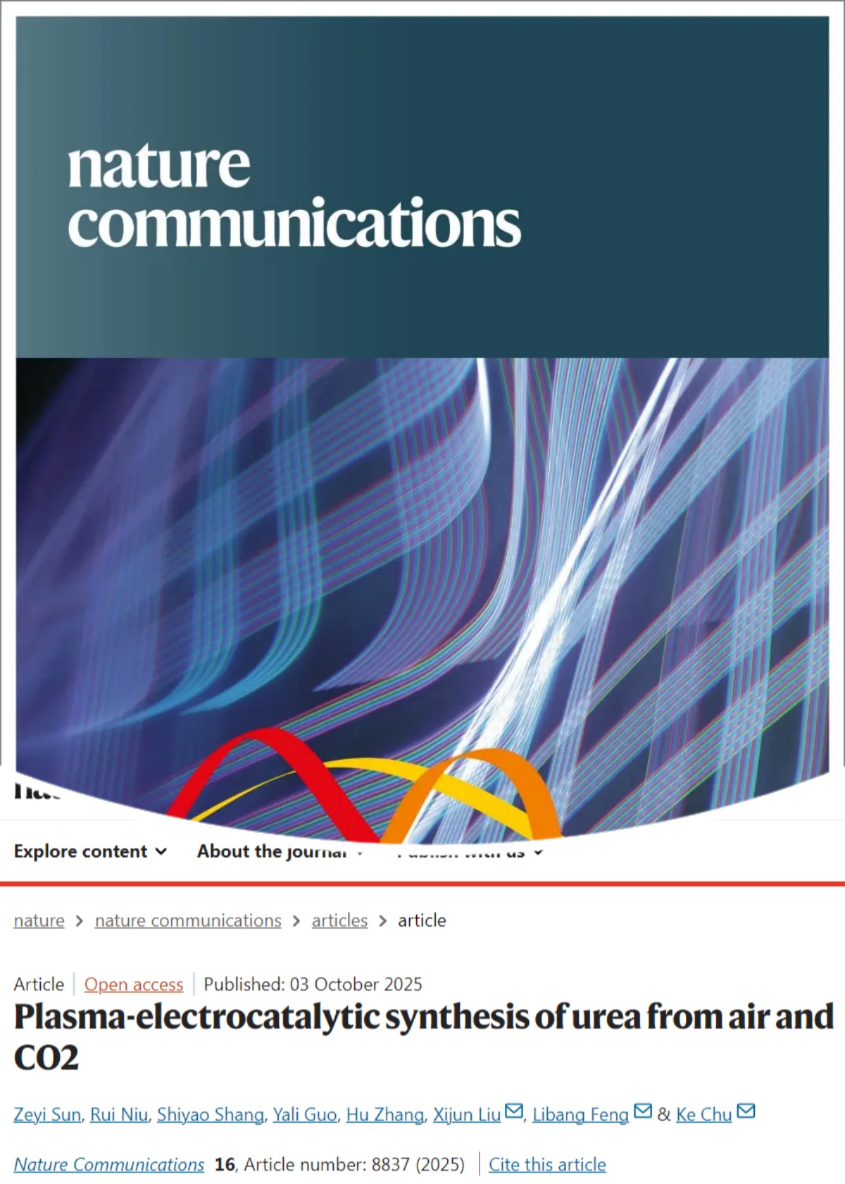 在强化项目申报的同时,材料科学与工程学院也在高水平成果产出方面实现重大突破。2025年10月,学院副院长褚克作为通讯作者,以兰州交通大学为第一单位在《Nature Communications》上发表了题为《Plasma-electrocatalytic synthesis of urea from air and CO2》的研究论文。这是我校首次作为第一单位在Nature系列子刊上发表论文,标志着学校在新能源材料与低碳催化领域的研究水平进入国际前沿。