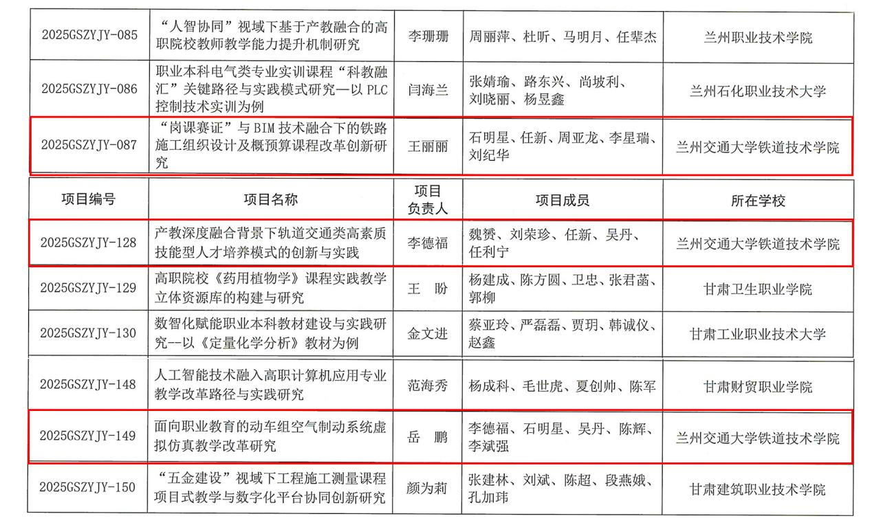 近日,甘肃省教育厅公布了职业教育教学改革研究项目2025年度立项结果,我校铁道技术学院王丽丽、李德福和岳鹏老师申报的三项职业教育教学改革研究项目获得立项。