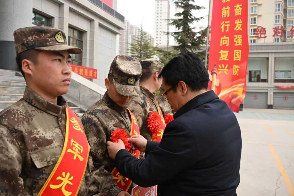 欢送仪式上,党委学生工作部负责同志转达了学校党委及全体师生对入伍学子的诚挚祝福与崇高敬意,为他们一一佩戴光荣大红花,送上慰问金和慰问品,同时高度赞扬了同学们携笔从戎、献身国防的青春担当与家国情怀,并殷切寄语全体新兵:一要坚定信念,迅速适应,迈好军旅生涯“第一步”,将个人理想融入强军实践;二要勤学苦练,发挥所长,将专业知识与军事技能有机结合,在火热军营中淬炼过硬本领;三要不忘初心、砥砺前行,永葆学子的蓬勃朝气和报国热忱,努力为母校争光,为军旗添彩。