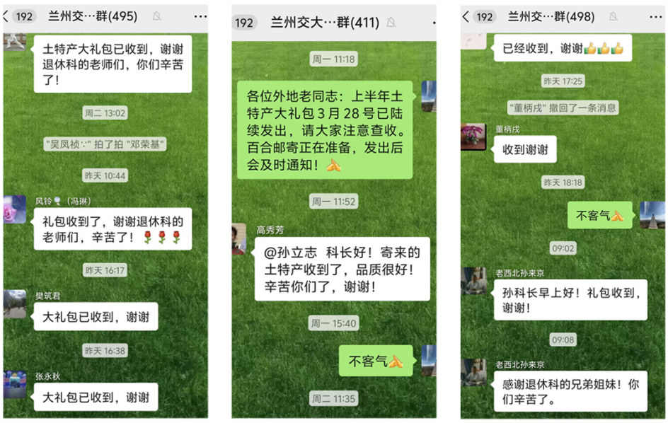 情暖桑榆,爱传千里。拆开礼包,熟悉的香气扑面而来,老同志们满心欣慰,纷纷通过电话、微信致谢,一句句“谢谢学校还惦记着我们”“你们辛苦了”,道尽了彼此间的深厚情谊。