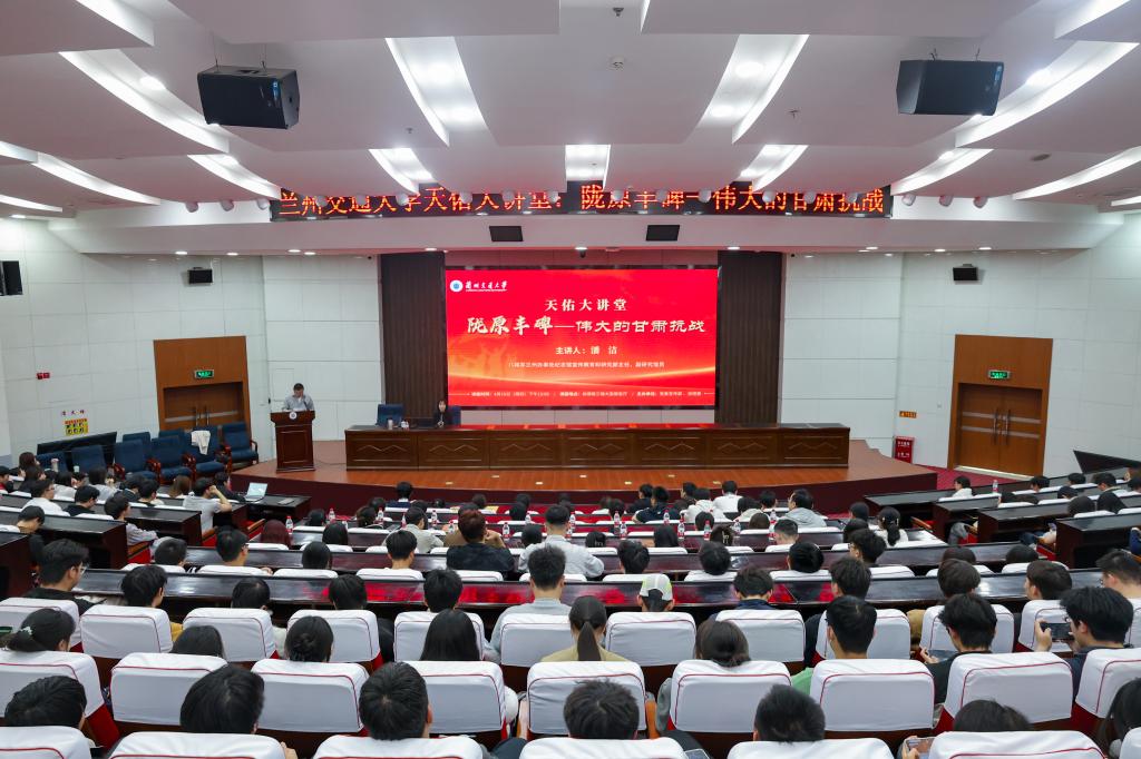 为深入学习贯彻习近平新时代中国特色社会主义思想,持续深化青年思想政治引领,引导广大团员青年从甘肃红色历史中汲取奋进力量,4月16日,由党委宣传部、校团委主办的本学期第二期“天佑大讲堂”在尚德楼三楼大型报告厅举行。本次讲座特邀八路军兰州办事处纪念馆宣传教育和研究部主任、副研究馆员,全国革命文物百佳讲述人、全国红色旅游五好讲解员潘洁作专题报告。校团委全体成员、各学院团委书记、青马班全体学员、第28届研究生支教团全体成员、校级学生组织干部及各学院学生代表共计300余人参加了本次讲座。
