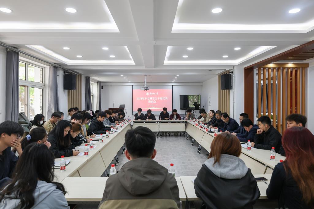 为深入倾听学生心声、回应学生关切,充分发挥学生干部桥梁纽带与示范引领作用,凝聚青年智慧力量,提升学生管理服务精细化水平,4月22日,学校在“一站式”学生社区召开2026年本专科学生干部代表座谈会。校党委常委、副校长苏程主持会议,党委学生工作部、招生就业处、校团委、教务处、后勤保障部、学生公寓管理中心等部门负责人及各专业本专科学生干部代表参会。